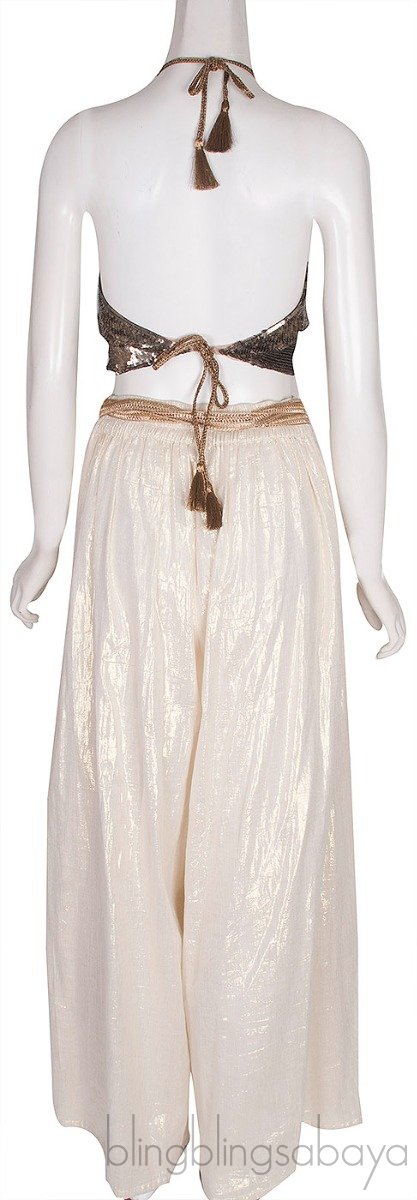 Metallic Wide Leg Trouser is crafted from 50% Cotton and 50% Lurex in white gold mettalix featuring an elastic waistine, wide leg with long slit in both sides, and gold detachable belt.