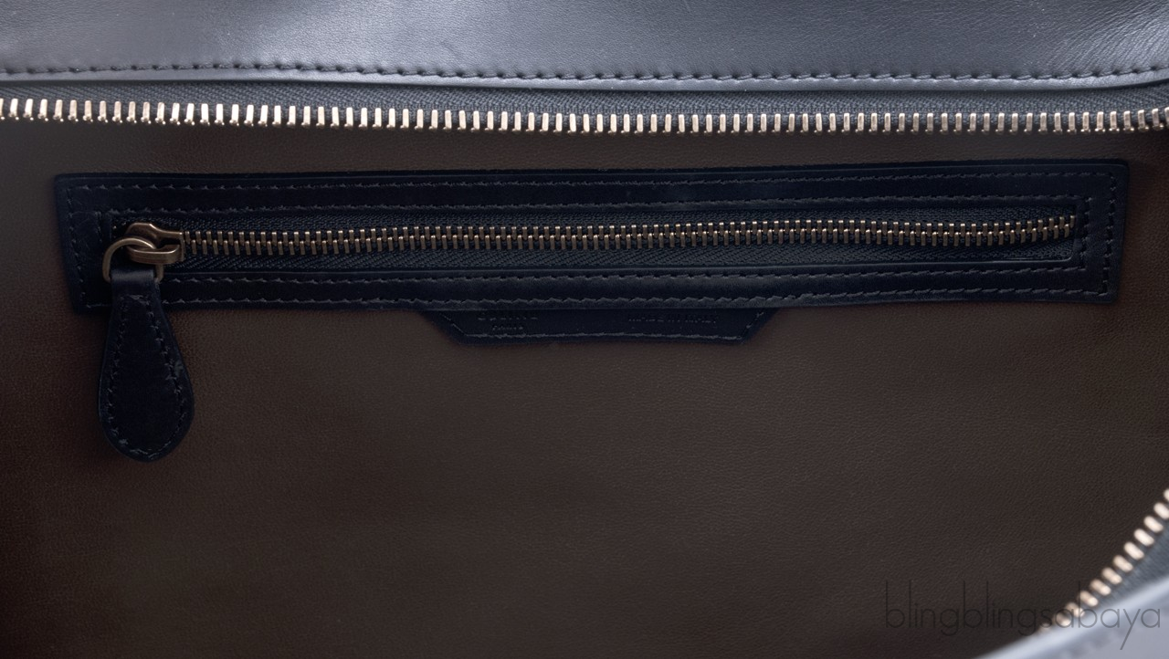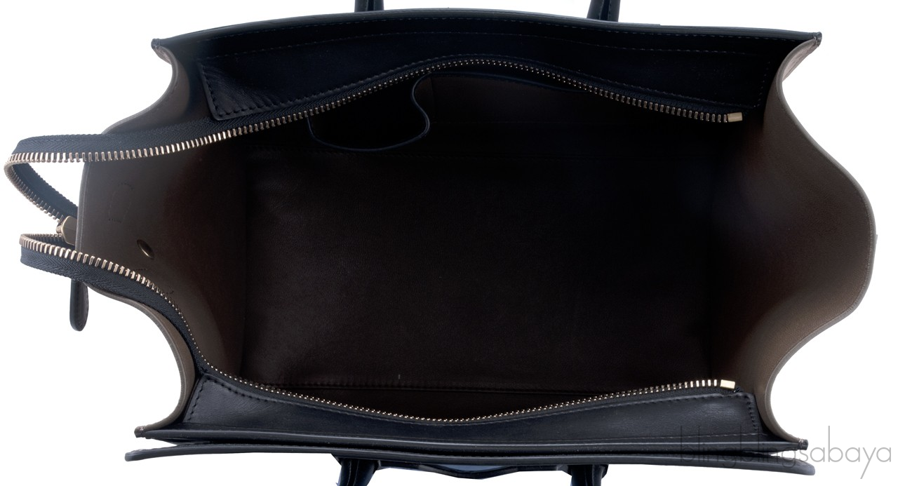 This fantastic mini luggage comes in two leather handles and the zippered top access to the black leather lining with the Bleu Suede leather trimmings on the pockets. The interior reveals one zippered pocket and two open pouch pockets all this in Lambskin leather.