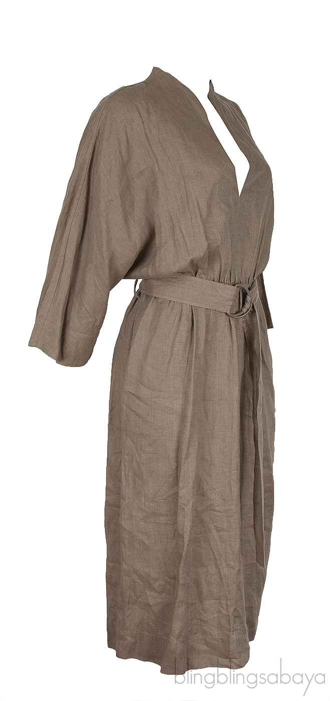 Moss Green V-neck Belted Linen Midi Dress from LORO PIANA!