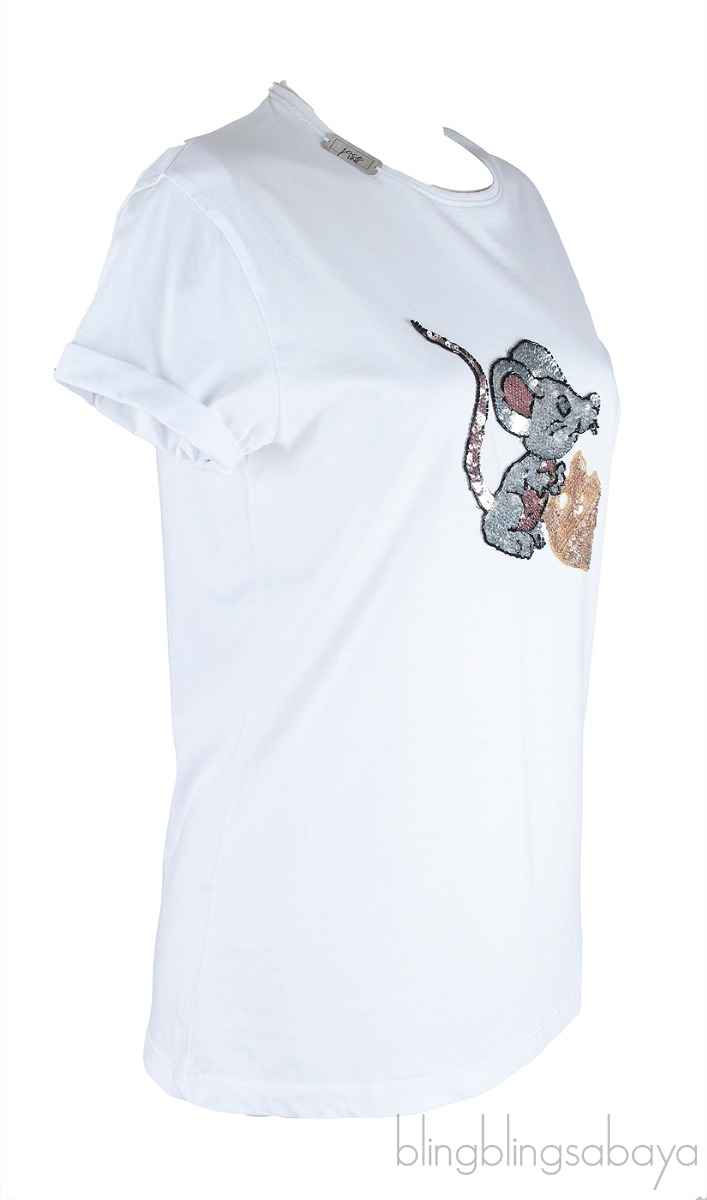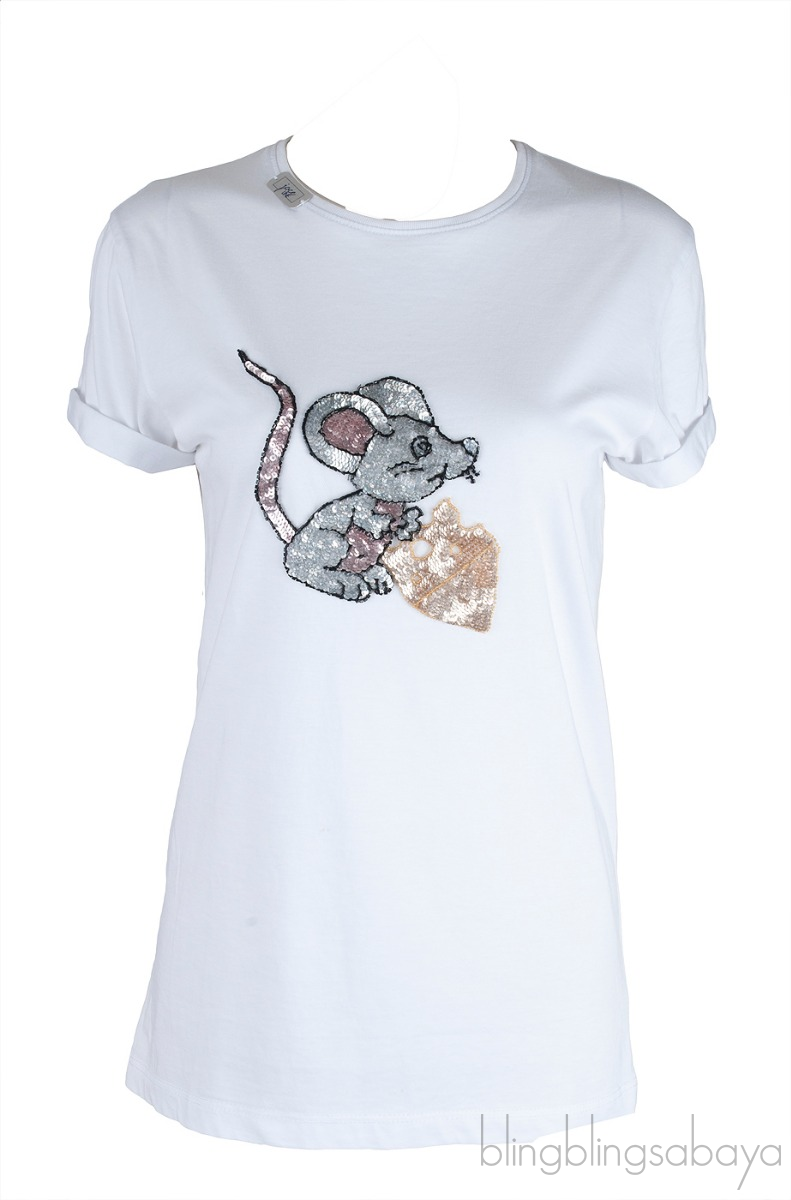This Mouse & Cheese T-shirt from Joce Line is crafted from 100% Cotton fabric in white or black hue color. This so comfy t-shirt features a round neckline, short sleeves and mouse and cheese motif embellished with beads and sequins.