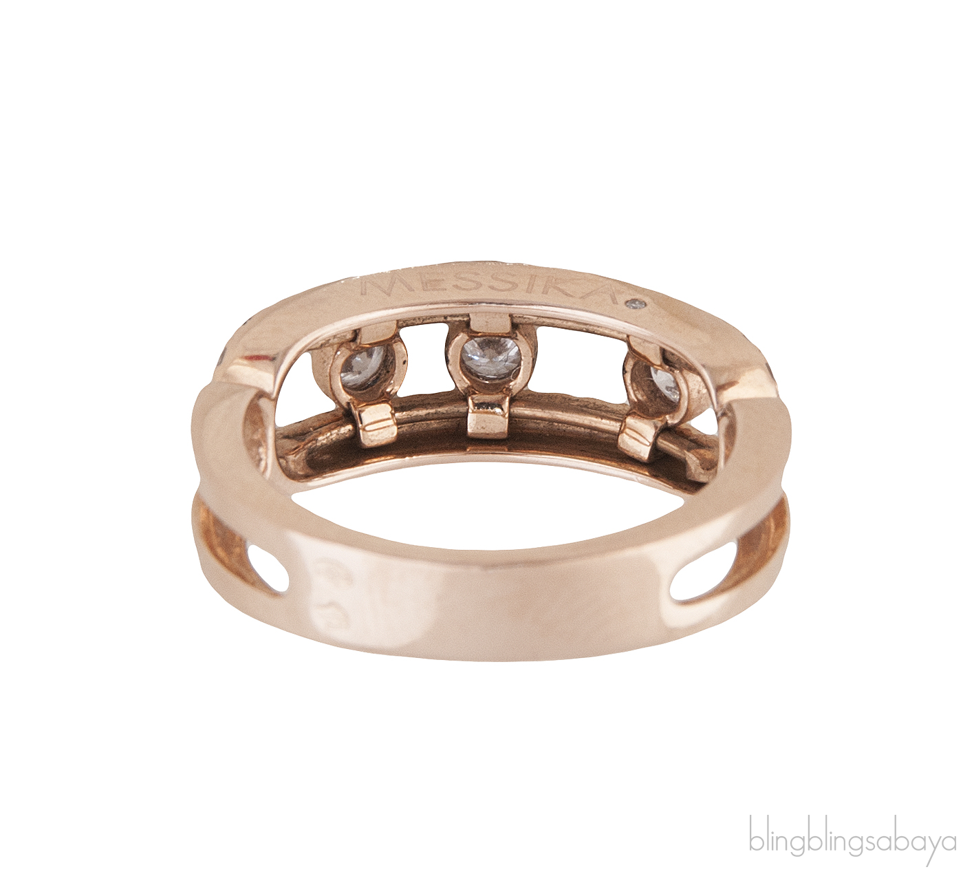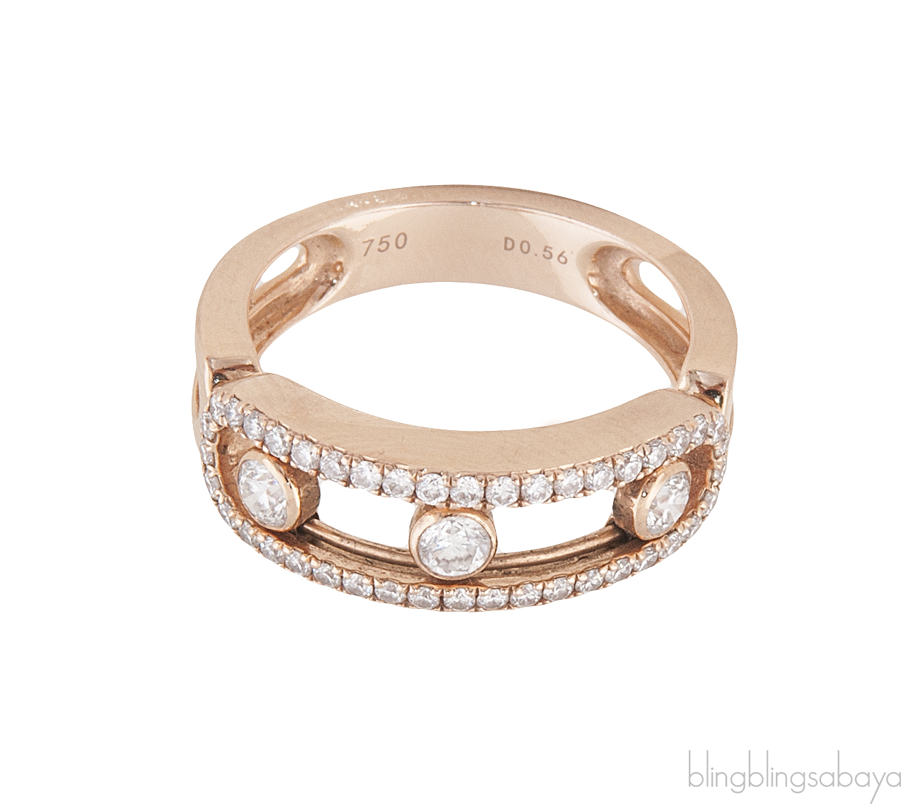 An iconic ring of the Move collectsion, is made of pink gold pink gold diamond band. It is fully handcrafted, and set with three 0,08 carat brilliant cut diamonds in motion its three diamonds move according to one's movements everyday. They are the high symbols of the love of yesterday, today and tomorrow or the memory of a great moment.