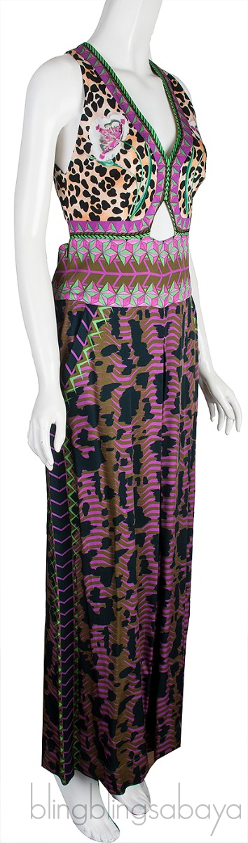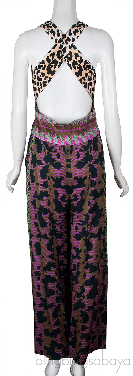 The Multi-color Print Jumpsuit is crafted in 100% Viscose fabric in multicolor hue. This features an abstract and animal print all-over, v-neckline, halter top, cut-out at front, criss-cross at back, zip fastening and flared pants