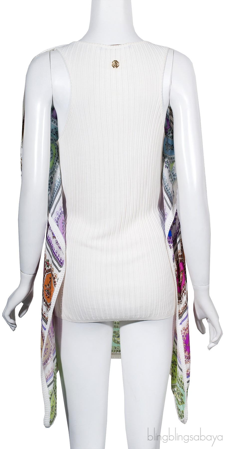 This Multicolor Print Sleeveless Top from Roberto Cavalli is made of 100% Silk & 100% Viscose fabric. This top features a multicolor print silk oversized front with knit trimming, round neckline, sleeveless and has off-white knit sleeveless at back.