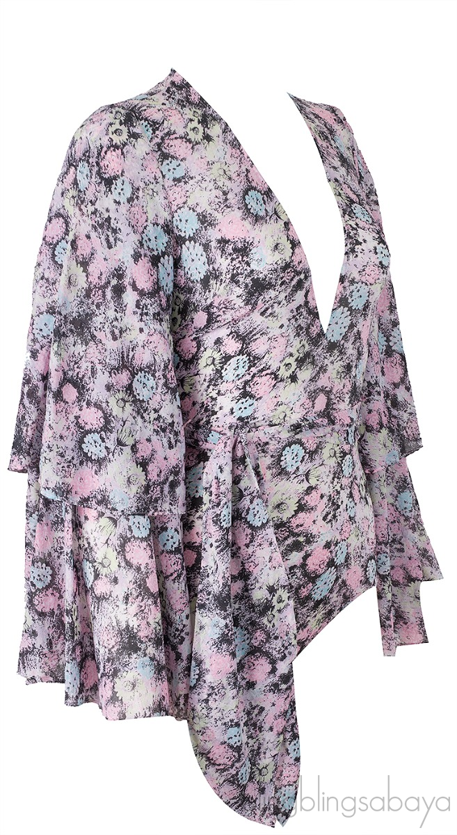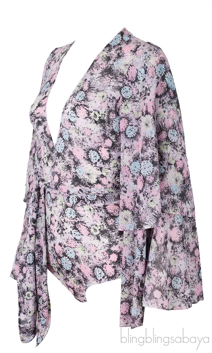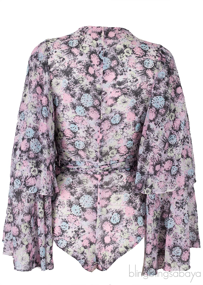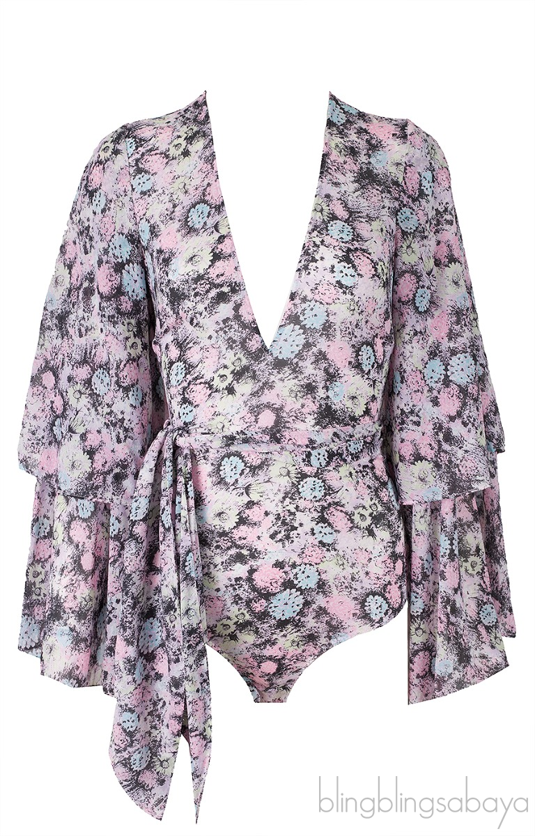 This Printed Body Suit from Agent Provocateur is made of 92% Silk, 8% Elastane and 100% Cotton Trim. This top features a deep V-neckline, layered bell sleeves, zip fastening at rear, body suit, and multi-color floral print al-over and comes with detachable belt