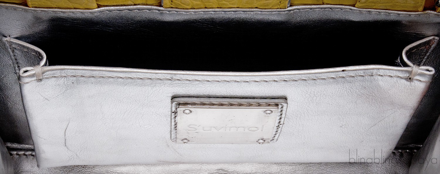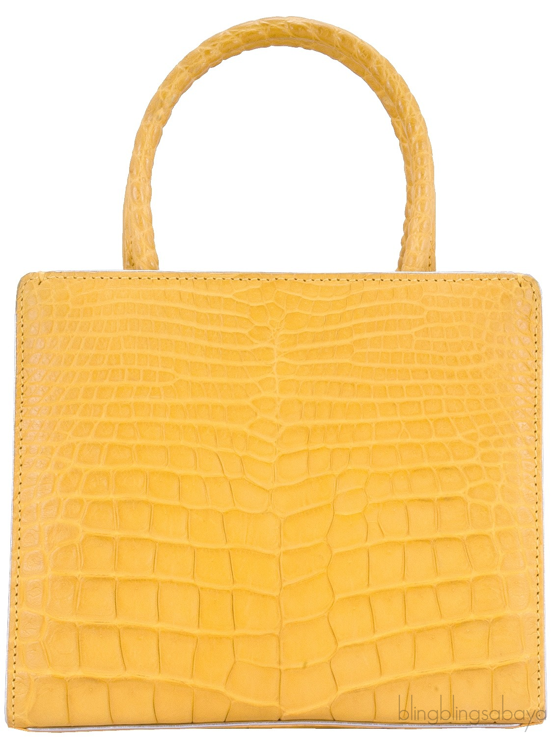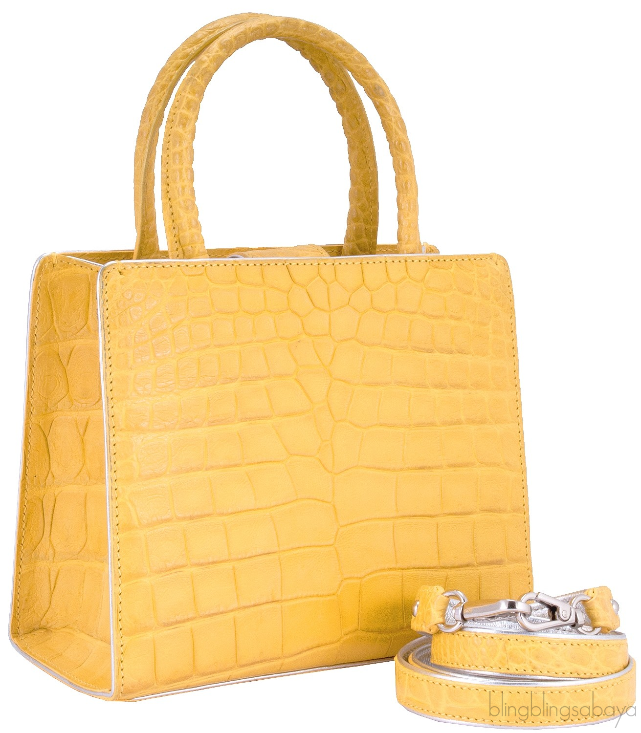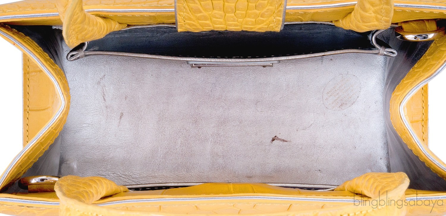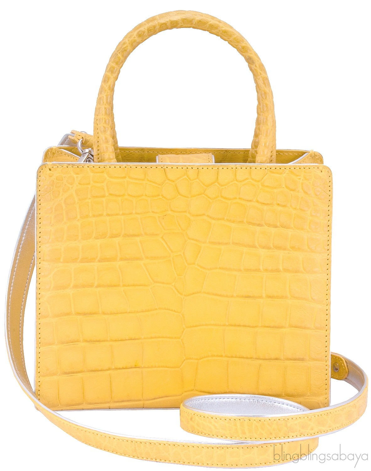 This stunning cute My Sweet Box Yellow Crocodile Bag from S'uvimol is crafted in vibrant yellow crocodile leather and silver leather lining. This bag features a structured design with two rolled leather handles and has detachable crocodile shoulder strap. It has the strap magnetic closure at top and interior is fully lined with silver leather lining. Interior reveals one flat pocket and one patch pocket inside with metal logo2 plate.