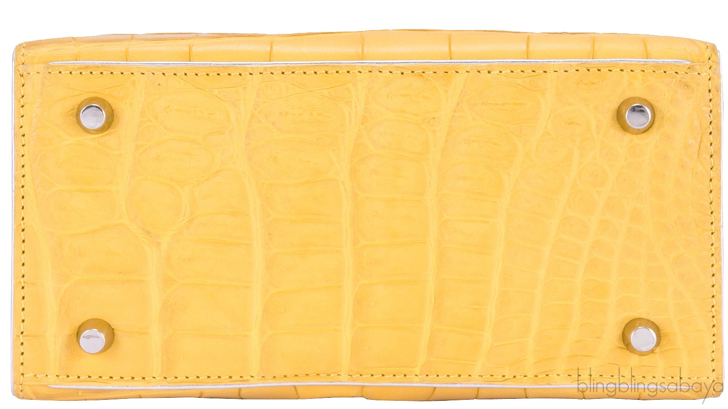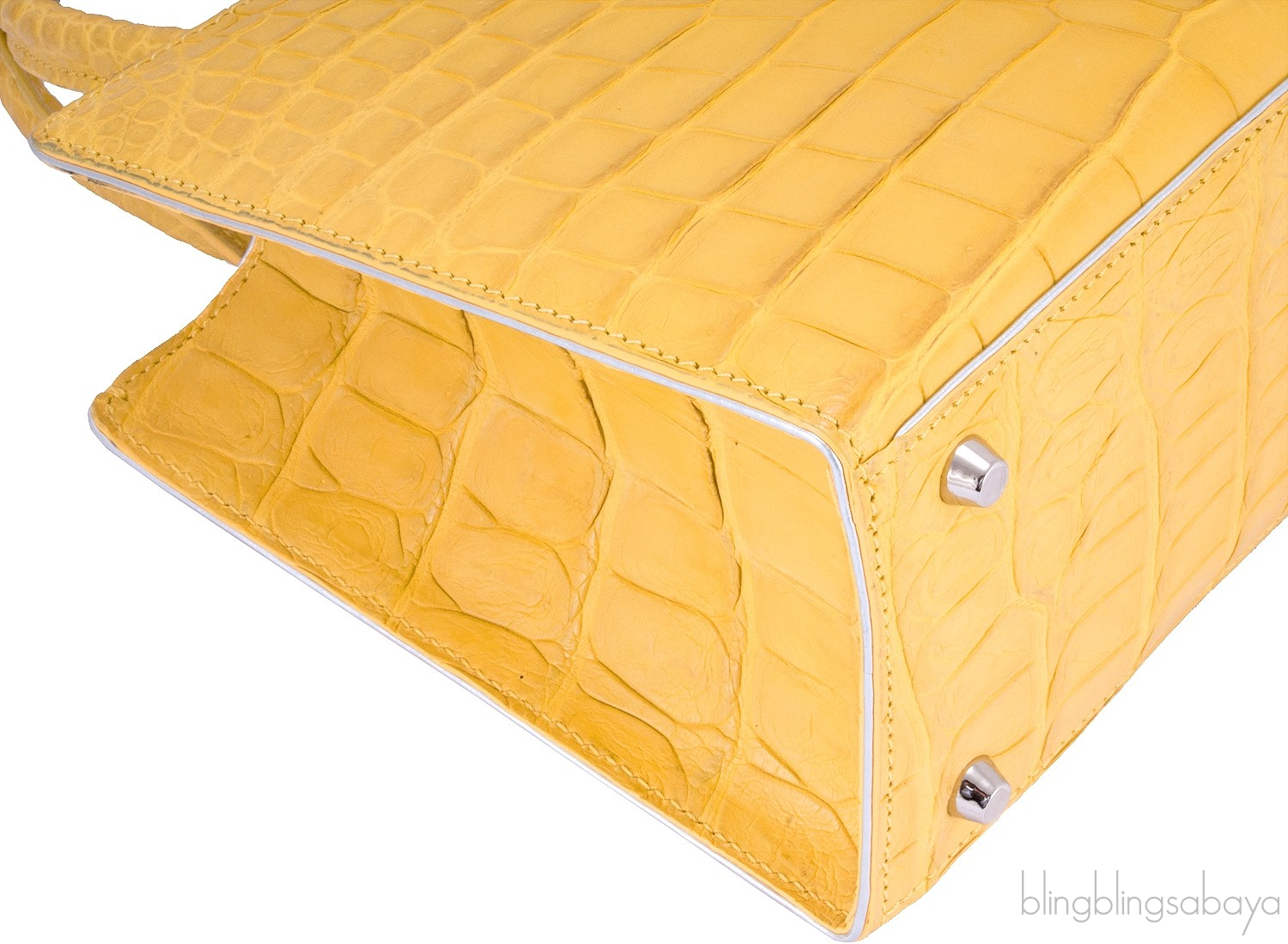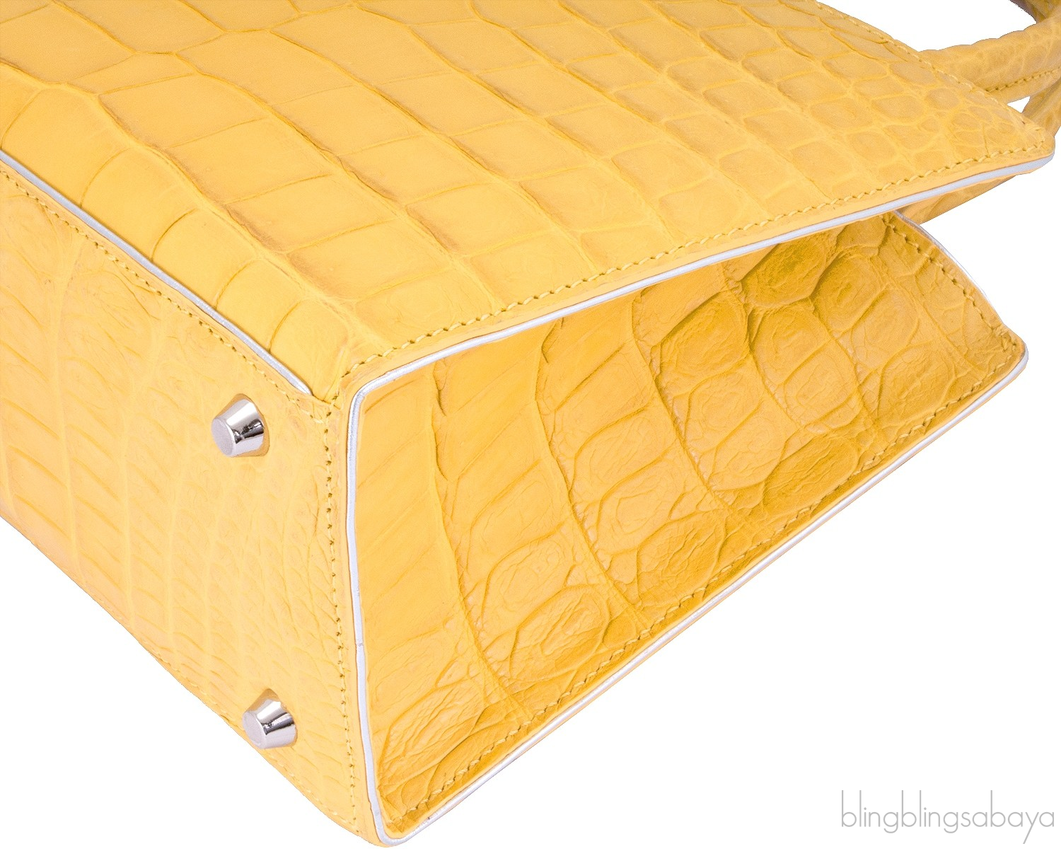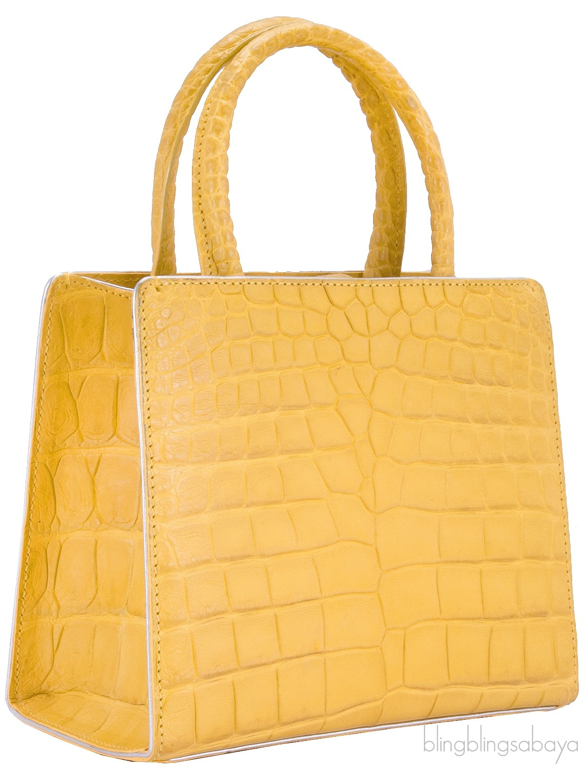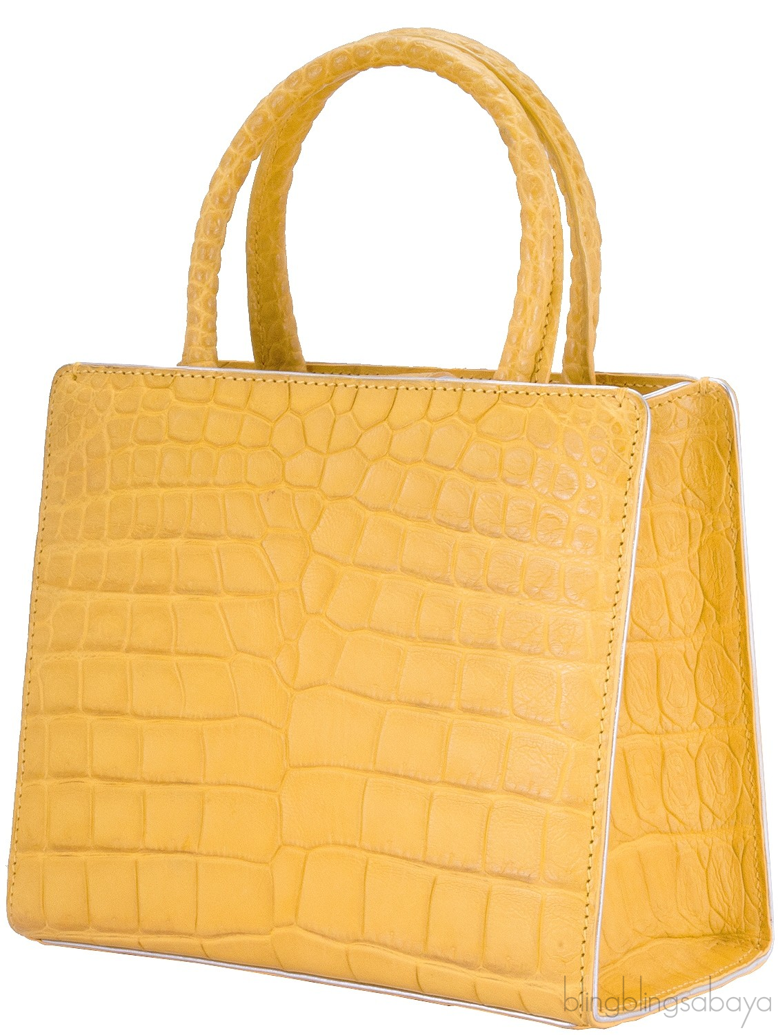 This stunning cute My Sweet Box Yellow Crocodile Bag from S'uvimol is crafted in vibrant yellow crocodile leather and silver leather lining. This bag features a structured design with two rolled leather handles and has detachable crocodile shoulder strap. It has the strap magnetic closure at top and interior is fully lined with silver leather lining. Interior reveals one flat pocket and one patch pocket inside with metal logo2 plate.