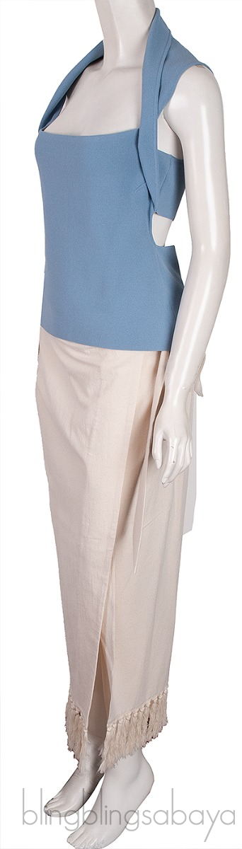 Naia Cut-out Top from Nanushka is crafted from stretch knit faric composed of 66% acetate, 20% nylon & 14% Polyester. This stretch top is in blue grey hue featuring a framed neckline, sleeveless, cutout back waist, fittted and pullover style.