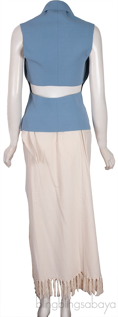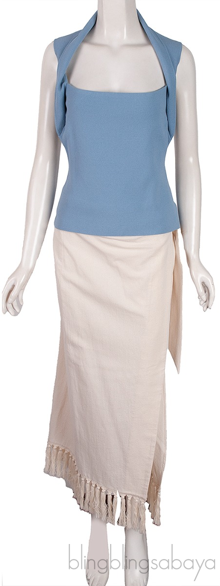 Randi Fringed Skirt is crafted from 100% Cotton fabric in off-white hue. This wrap skirt is in lightweight non-stretch fabric, fringe trim, self-belt at waist faux welt back pockets.