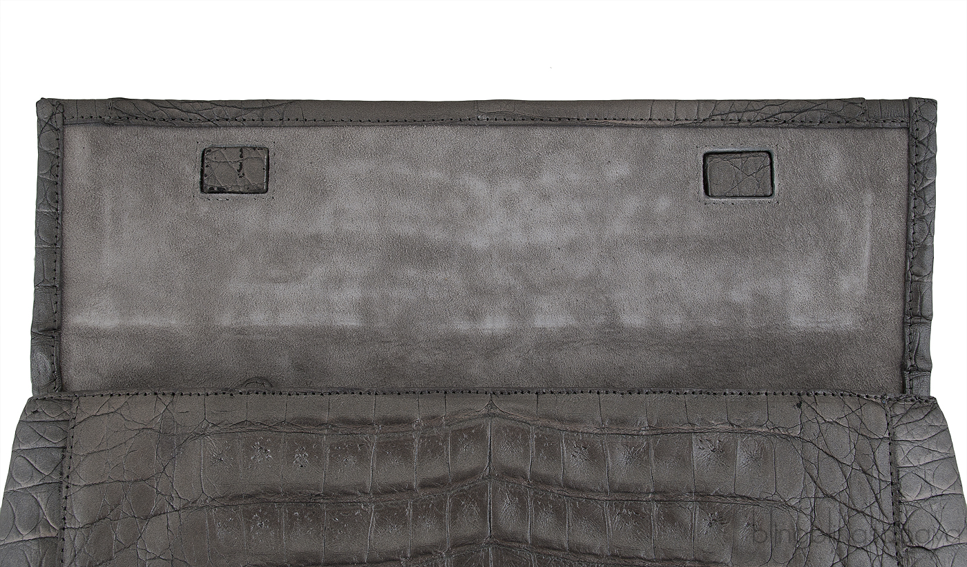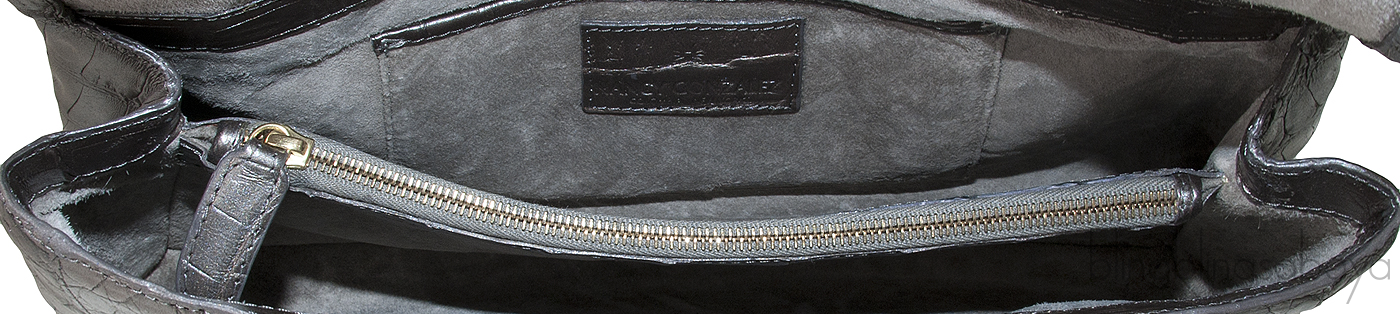 Interior is lined with light grey suede leather has two major compartments divided with a zip compartment at mid-center and has one patch pocket with leather trim and small crocodile patch pocket inside.