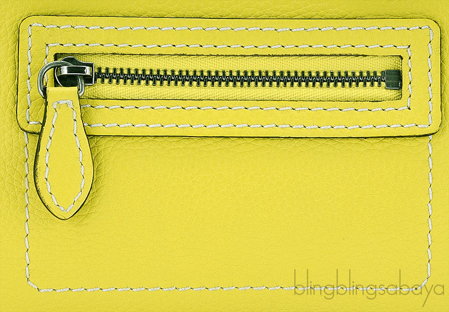 This hot and rare handbag comes in two leather handles and the zippered top access to the Citron yellow leather lining and trimmings on the pockets. The interior reveals one zippered pocket and two open pouch pockets.