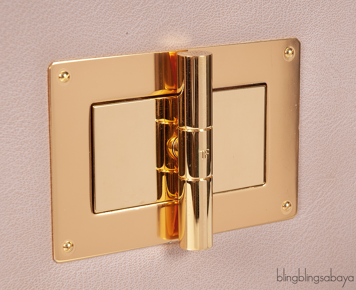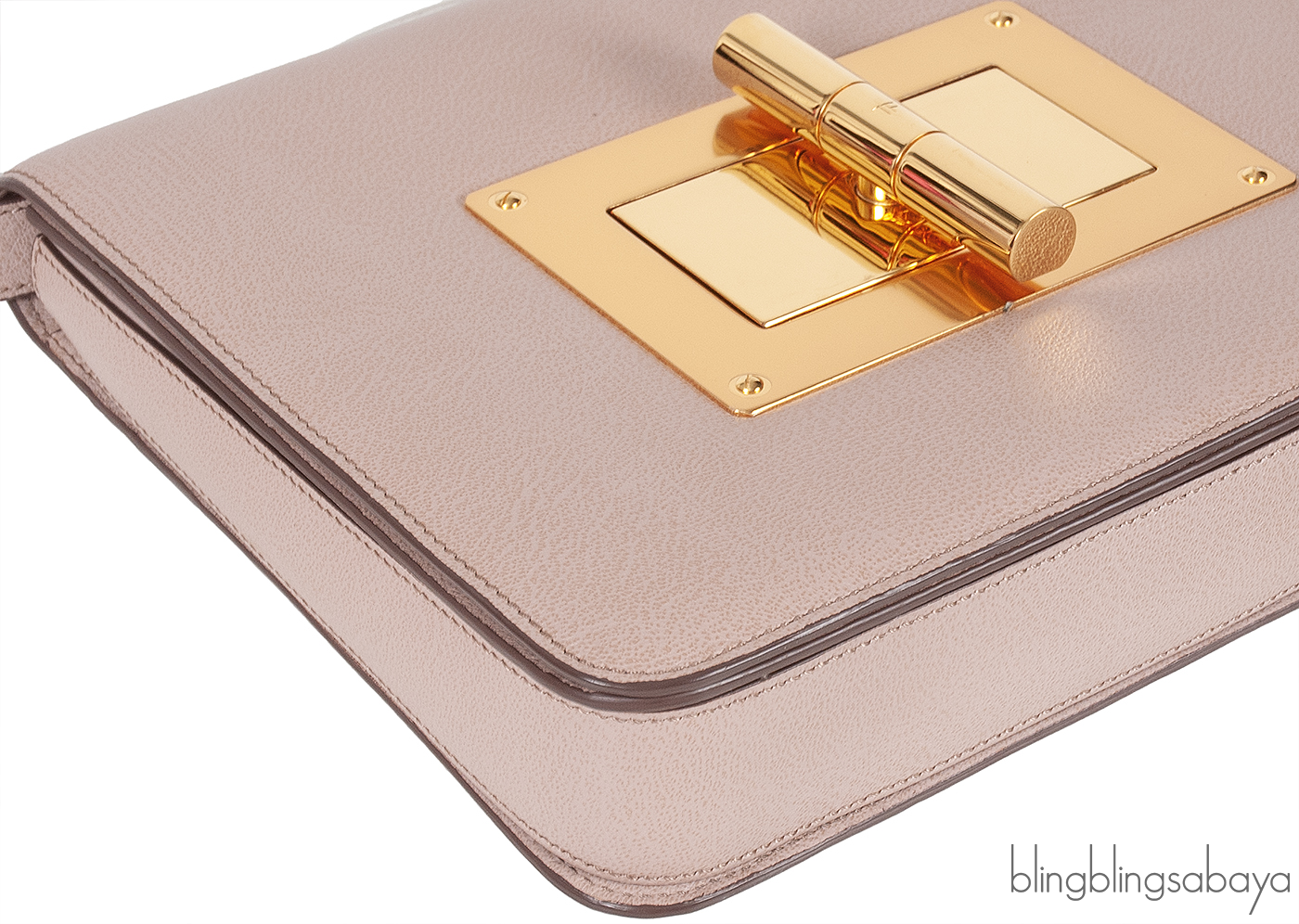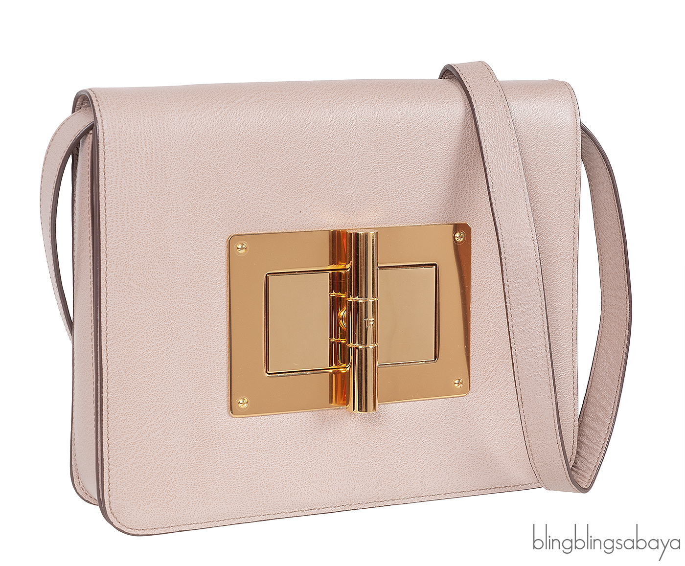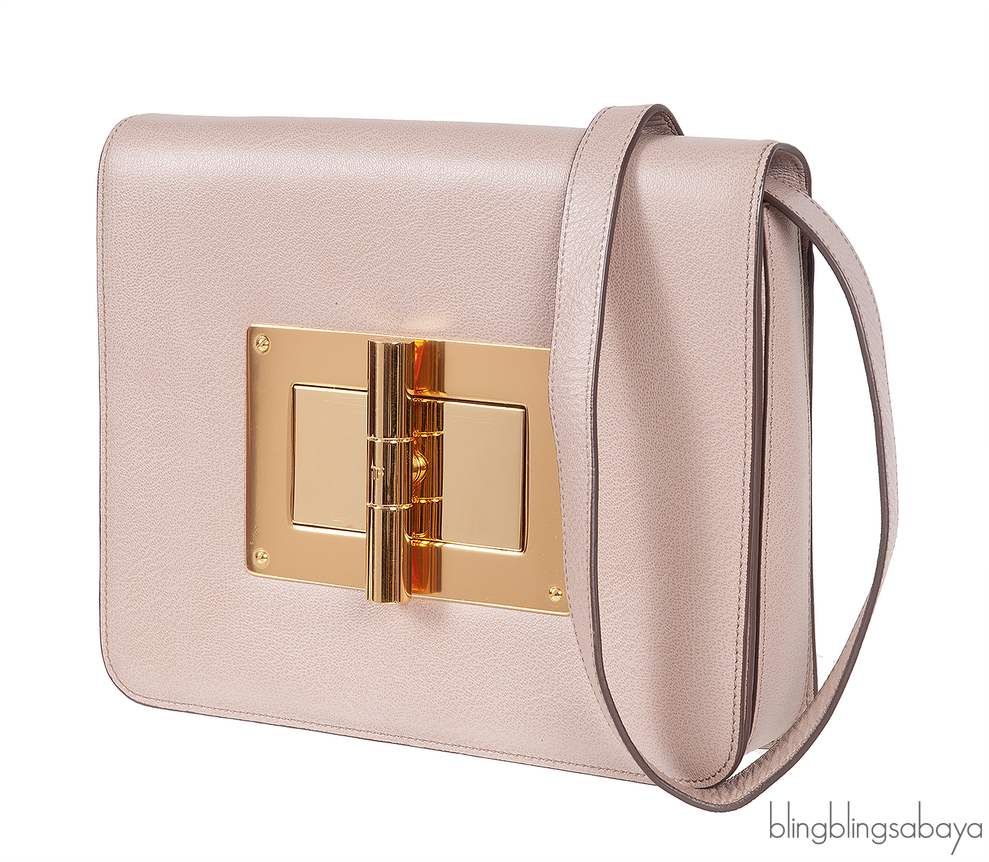 This incredibly chic Natalia Shoulder Bag from Tom Ford is crafted in Nude leather accented with the golden Hardware. This features the enormous turn lock closure with logo2 "TF" engraving at the center. This piece comes in a removable, adjustable shoulder strap and has the flap top opening. Interior is lined with coordinating leather featuring three compartment and a zipper pocket. There is an exterior flat pocket that is an ideal place for easy to access necessities.