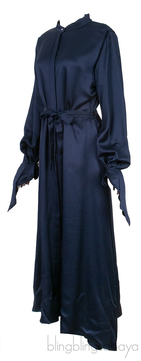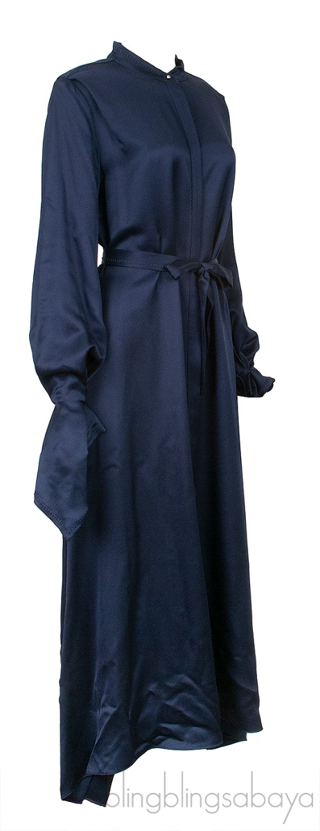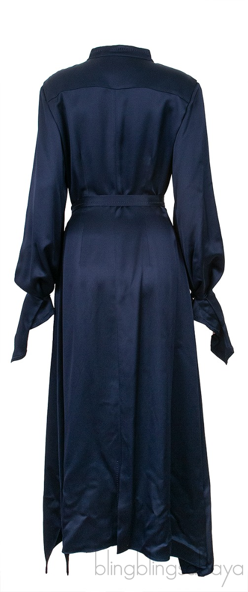 This Navy Blue Asymmetric Cuff Dress from Roland Mouret is crafted in 69% Viscose and 31% Acetate in navy blue hue. This dress features a chinese collar neckline, concealed button fastening at front, long sleeves with gathered asymmetric cuffs and has detachable fabric belt.