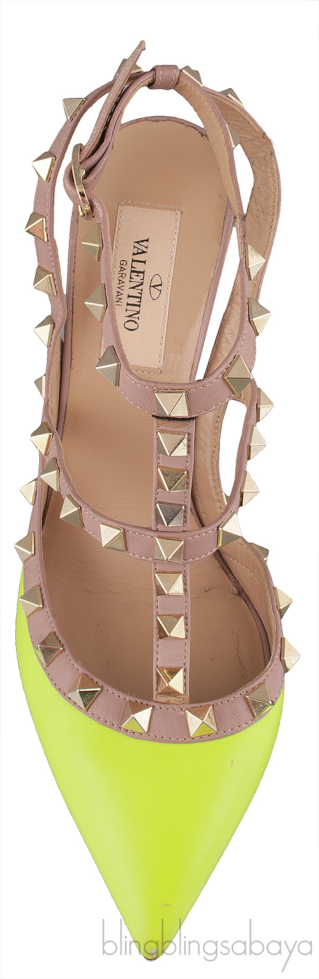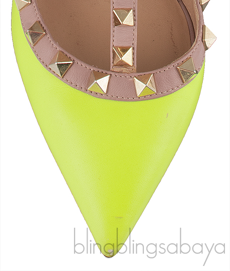 This gorgeous chic Neon Green Rockstuds Leather Pump from Valentino is crafted in Neon Green Leather with nude leather trimming and strap. This stunning pump has the hand-applied and galvanized pyramid studs giving the shoes a rock & funky look. It has a pointed toe, a golden buckle fastening ankle strap, brand embossed insole and 90 mm heel.