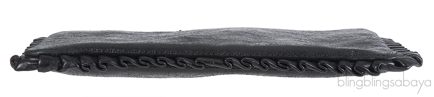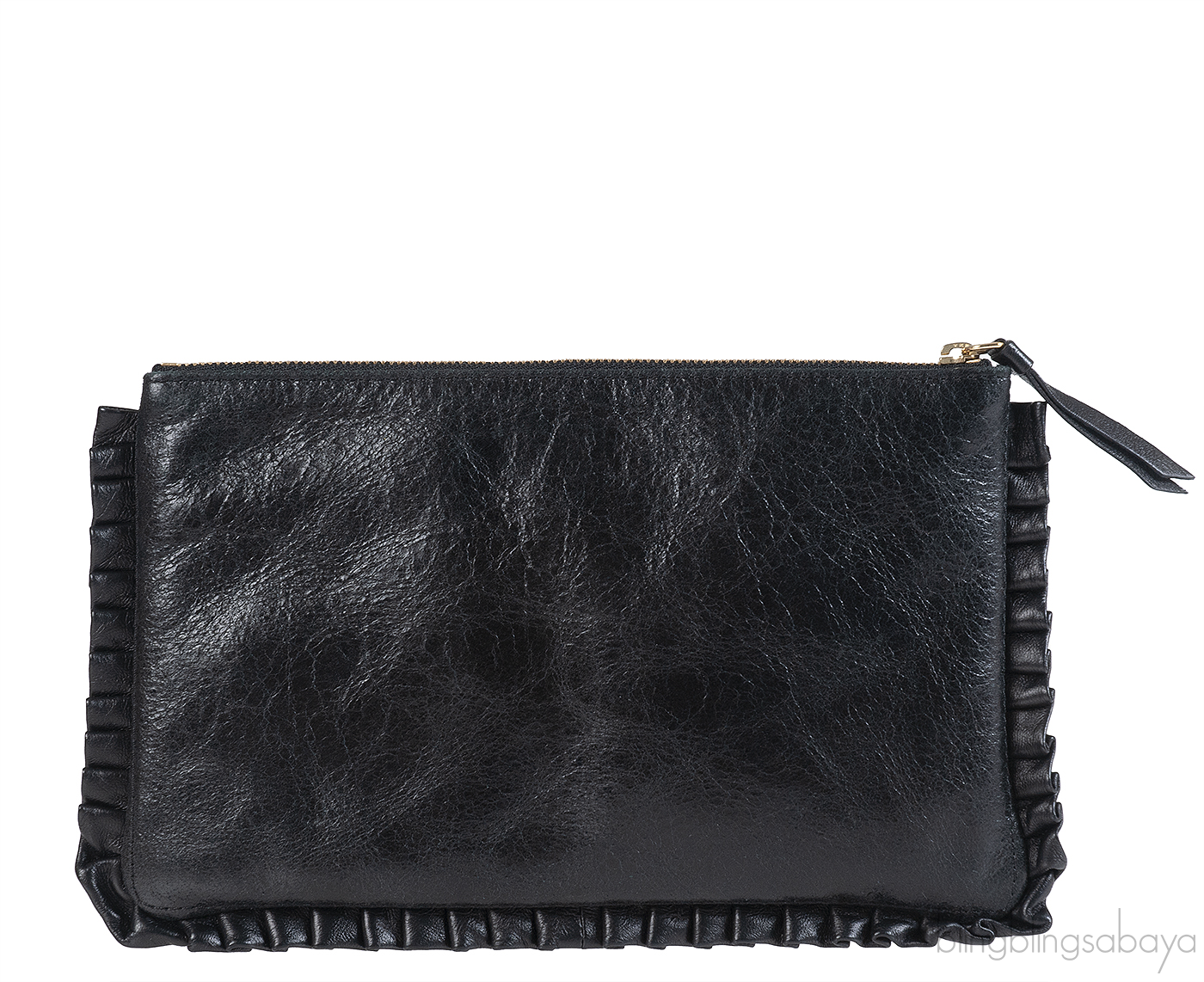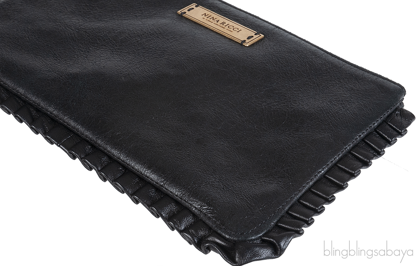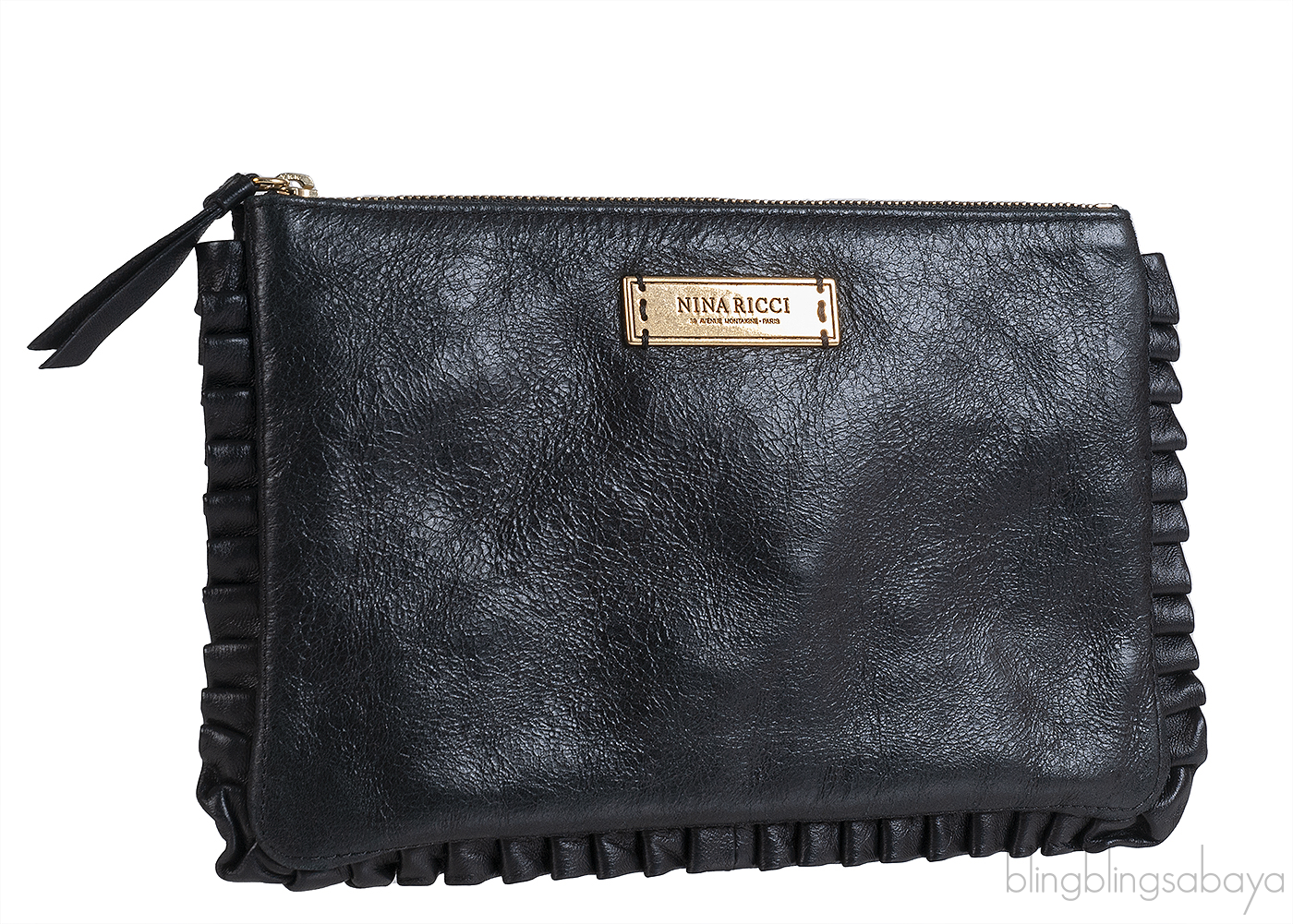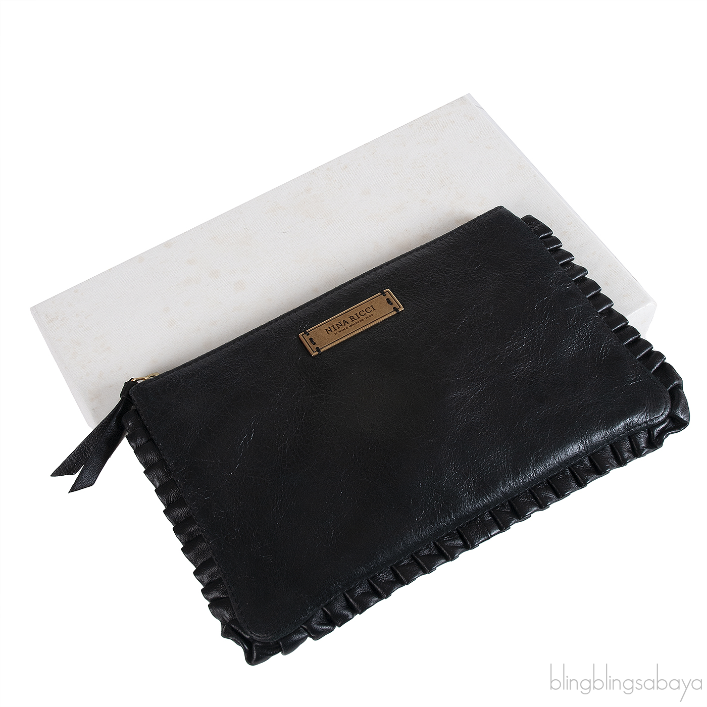 This Black Pleated Trim Clutch from Nina Ricci is crafted in black leather featuring a rectangular clutch with pleats trimming on edges with gold plate logo2 detailing at front. It has the top zip opening with zip leather pulls giving access to roomy interior with no pockets and has pink fabric lining.