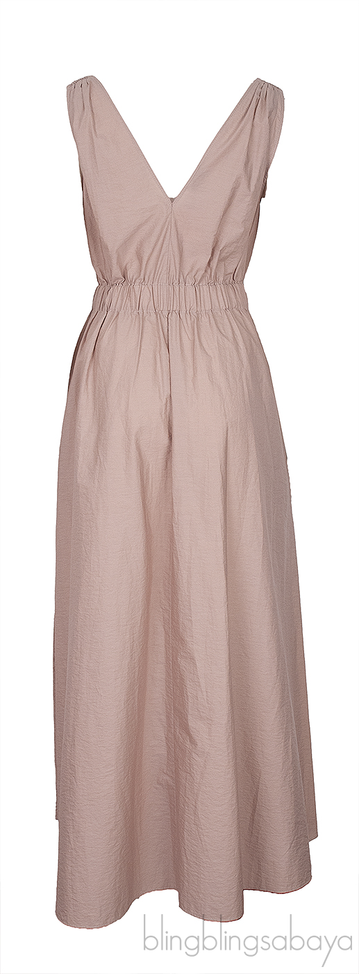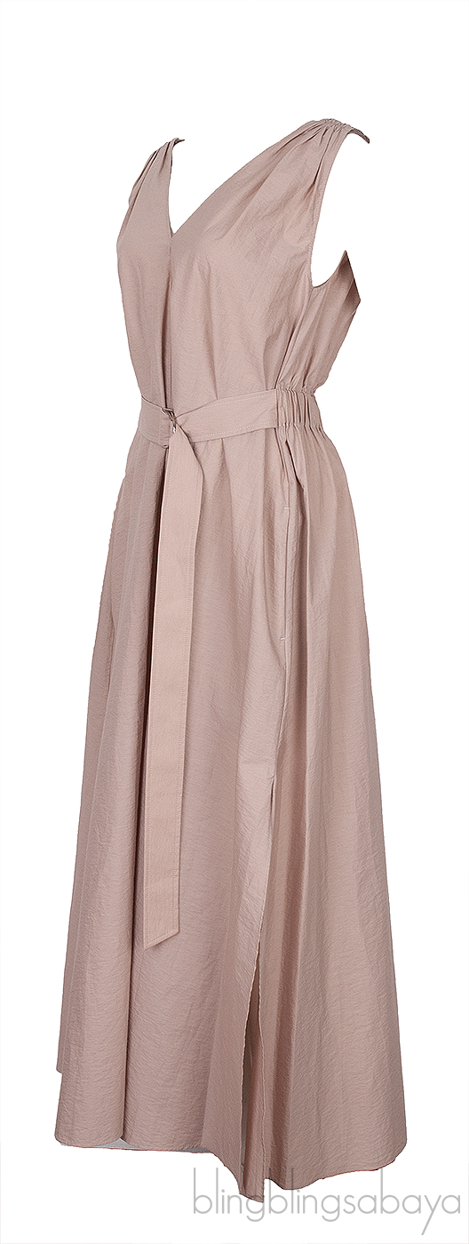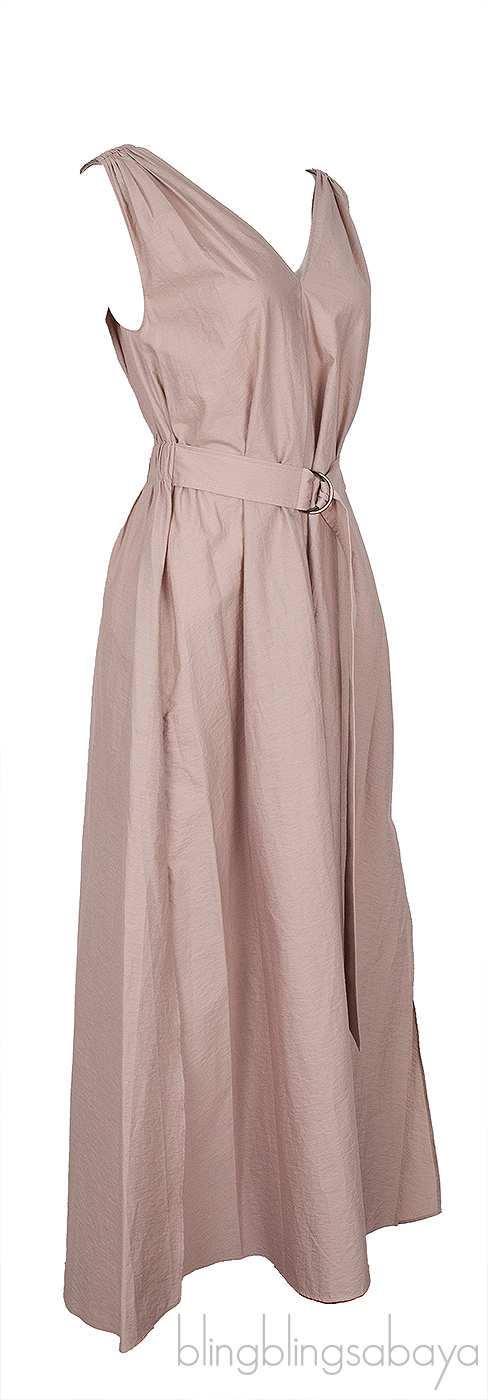 This Nude Poplin Minili Shoulder Belted Midi Dress from Brunello Cucinelli is crafted from nude plain fabric featuring a v-neck at front and back, gathered shoulder with monili details, elastic at waist line at rear, undetachable belt with D-ring.