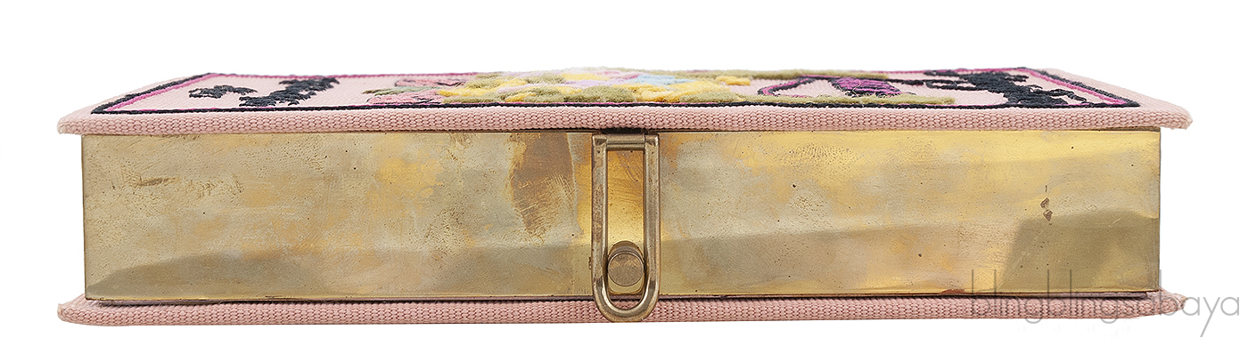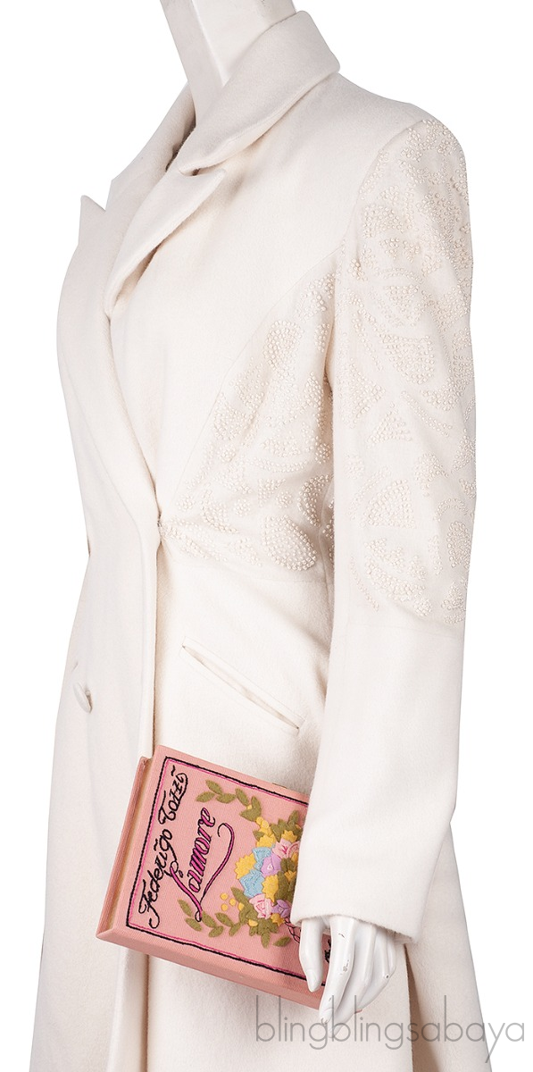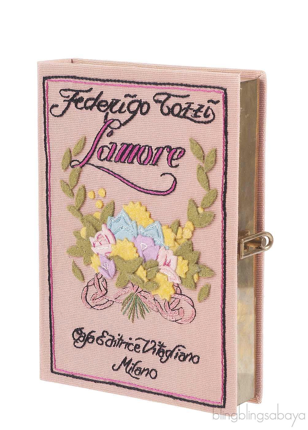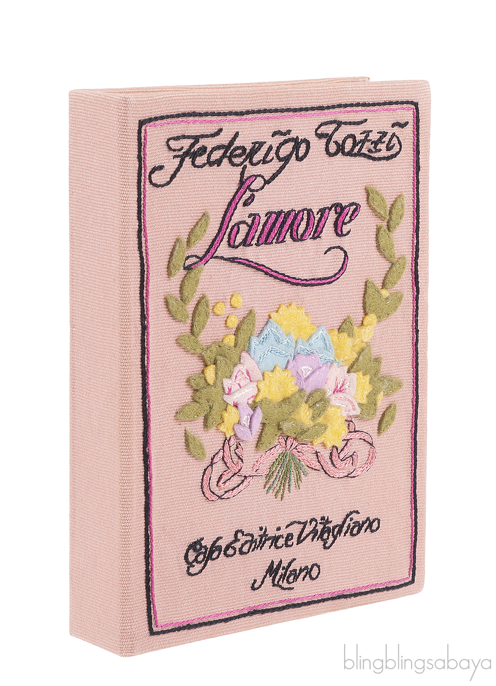 This L'amore Pink Clutch from Olympia Le-tan is handcrafted Pink cotton canvas clutch features a multicolored embroidery and felt, flower design at front with "Federigo tozzi La more" embroidered at the top and "caja editrice vitagliano milano" embroidered at the buttom , designer-stamped gold metal frame, stitched identity number at back and interior fully lined with floral print with small slit pocket.
