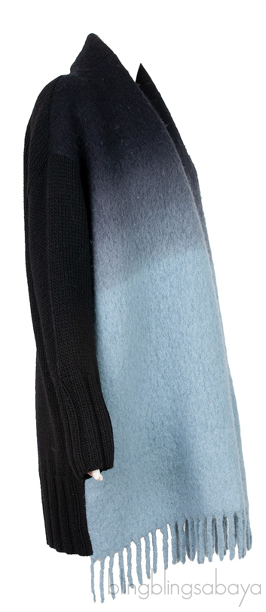 This Ombre Knitted Fringed Jacket from Virginia Bizzi is crafted from acrylic and wool blend fabric. This jacket features an ombre scarf like design at front with fringed edges, open front, knitted bacl and sleeves with ribbed cuffs and hemline and side pockets.