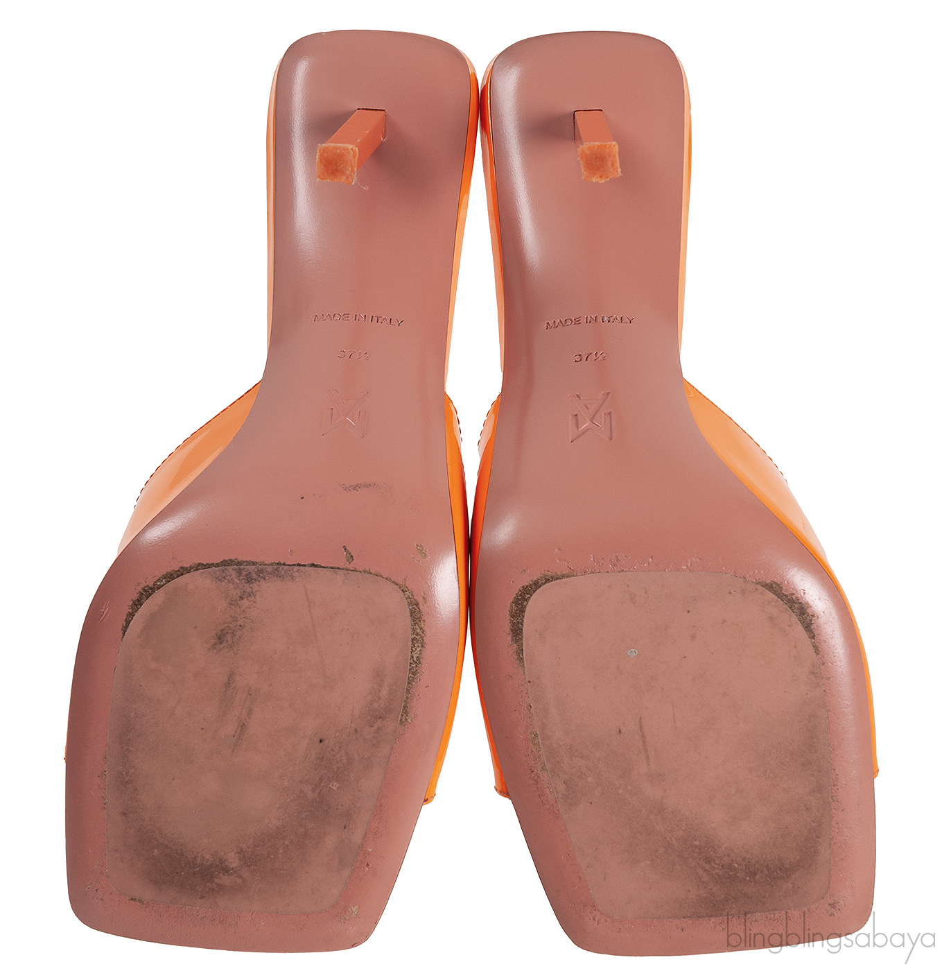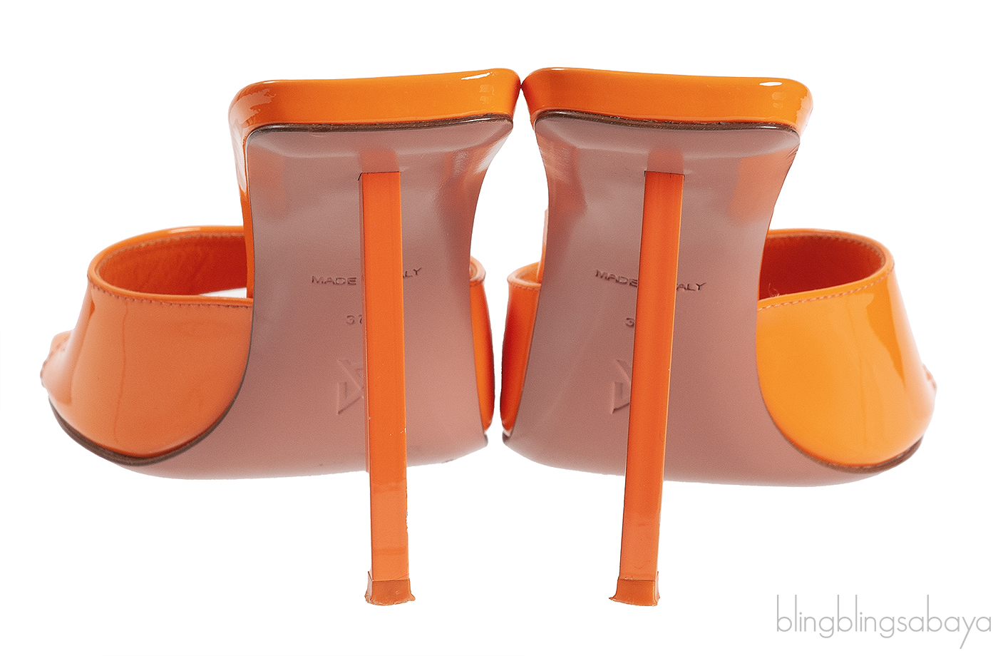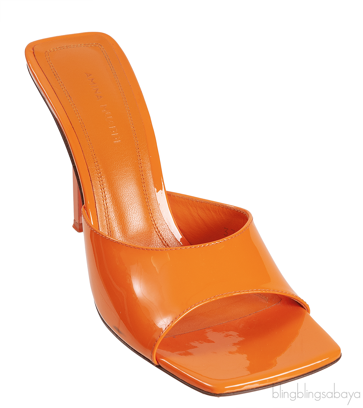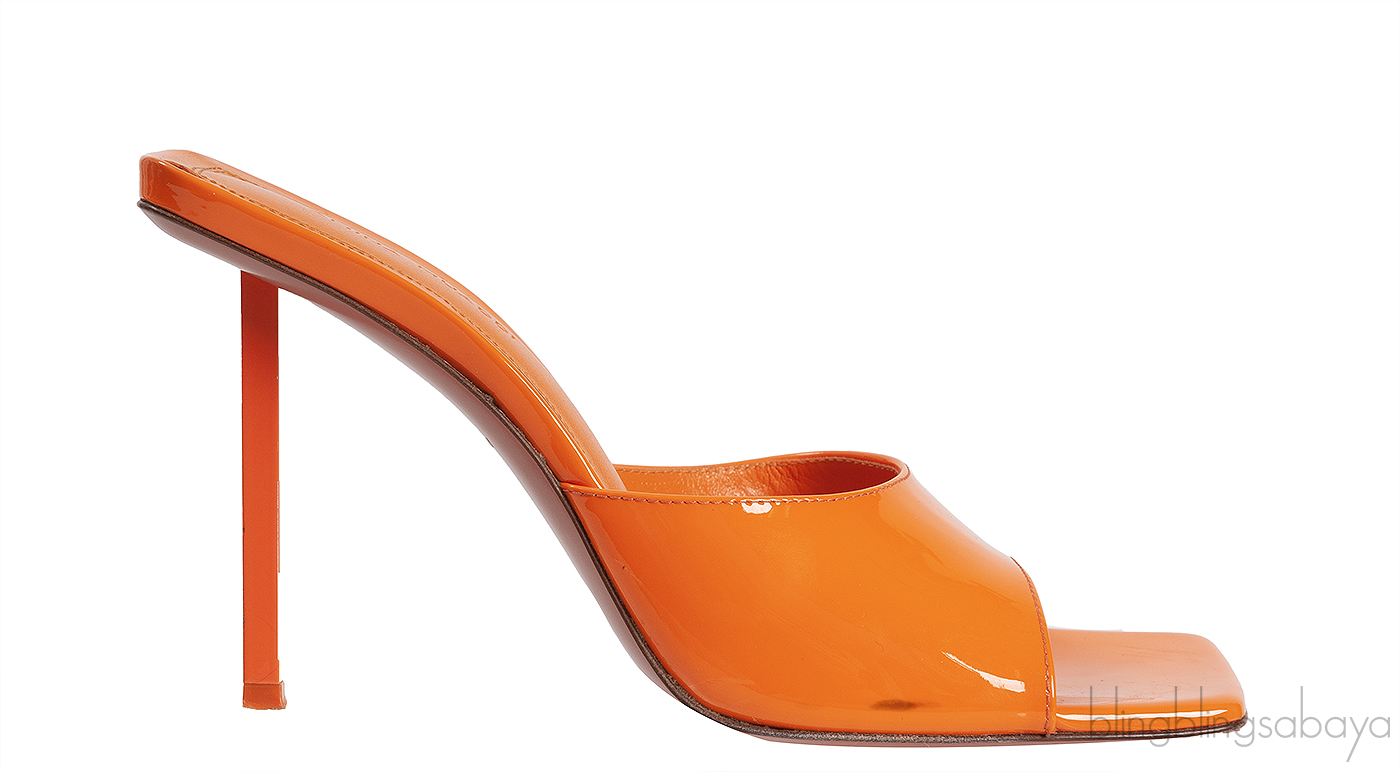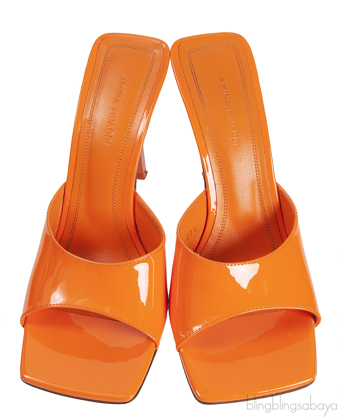 These Orange Laura 95 Mules from Amina Muaddhi are crafted from orange patent leather with leather lining. These mules features a square peep toe, leather lined insole and sole and heels measuring 95 mm high.