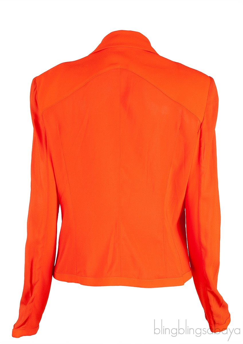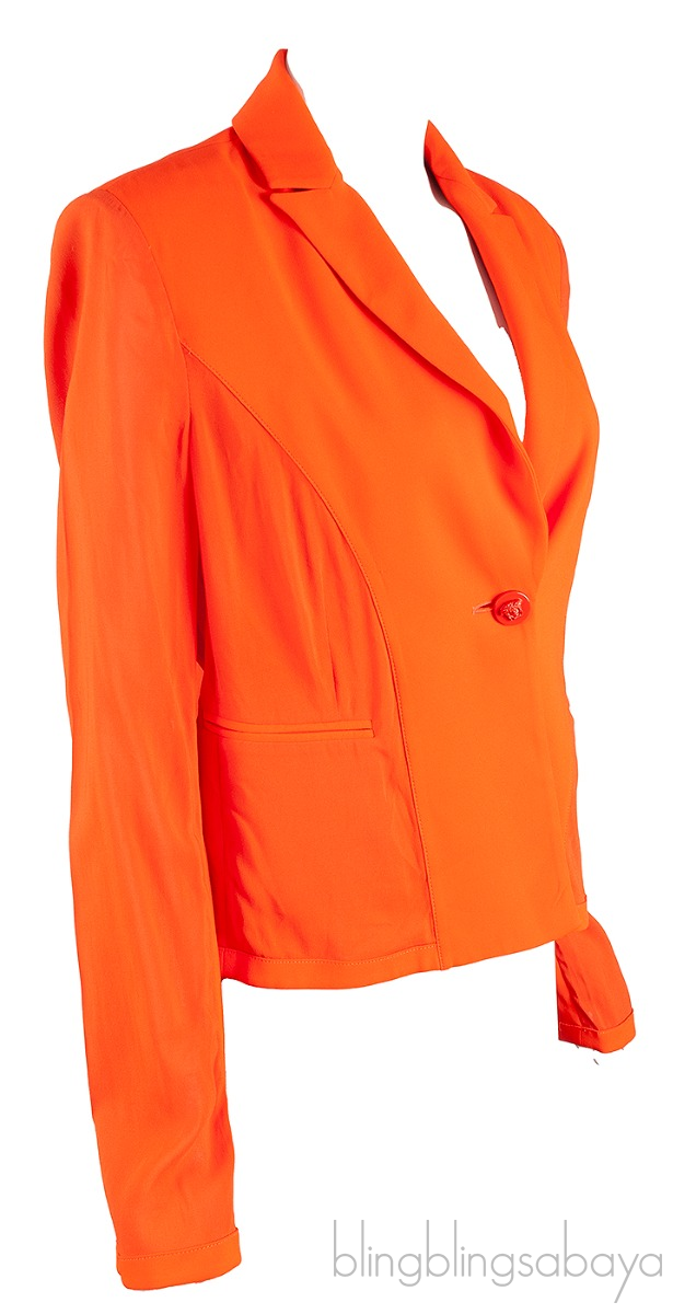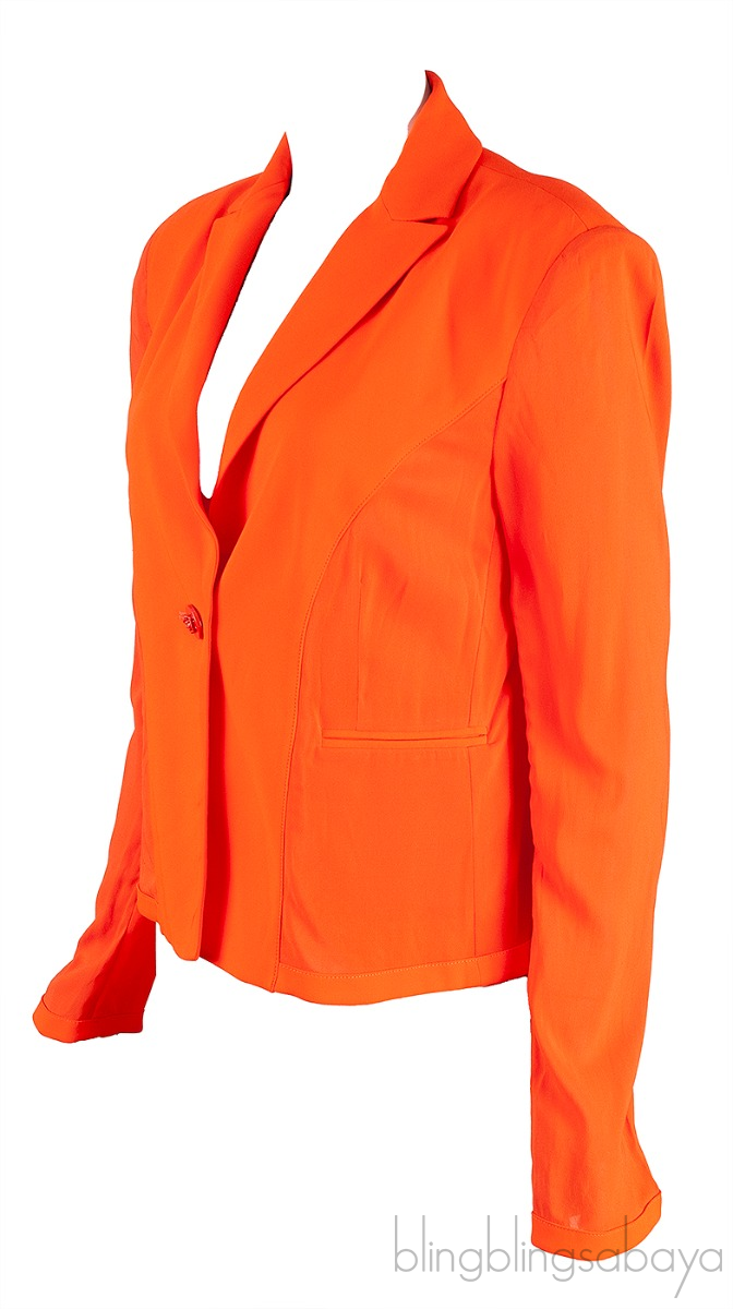 This Orange Padded Shoulder Blazer is crafted from 95% Viscose and 5% Elasthane in orange hue featuring a classic collar, faux pocket at front, padded shoulder. long sleeves, and button at front.