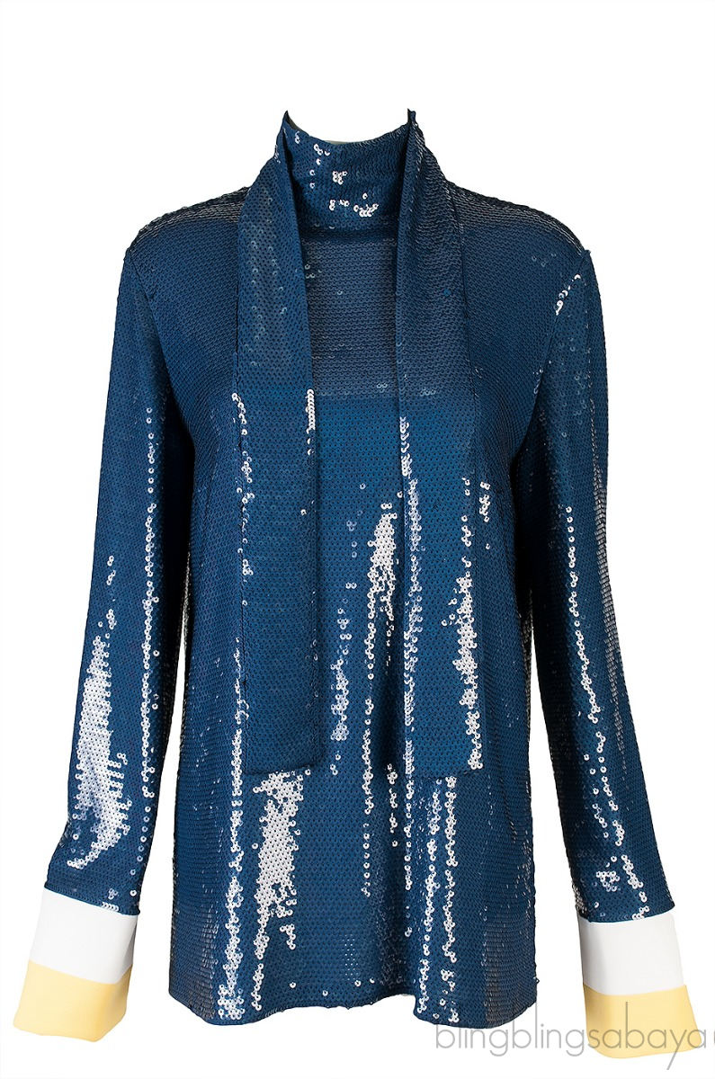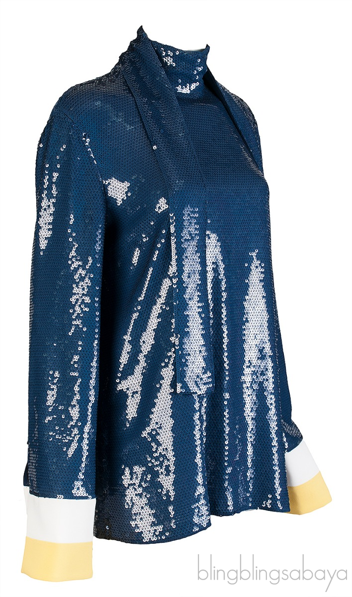 This Oversized Cuffs Sequin Blouse from Emilio Pucci is crafted from 90% Silk, 9% Viscose, 1% Elastane fully decorated with blue sequins. This top features a close neckline with self-tie fastening at back, long sleeves with overzised cuffs in contrasting white and yellow hue.