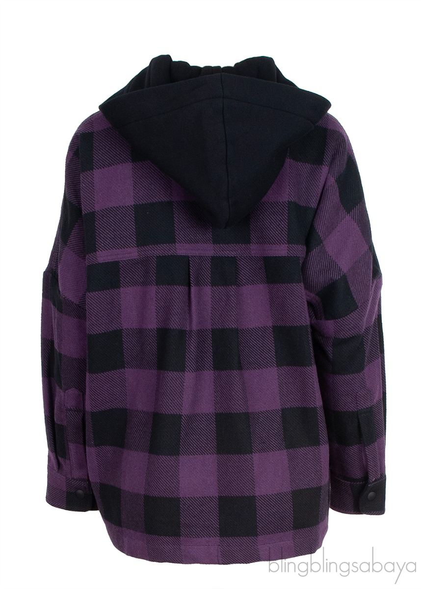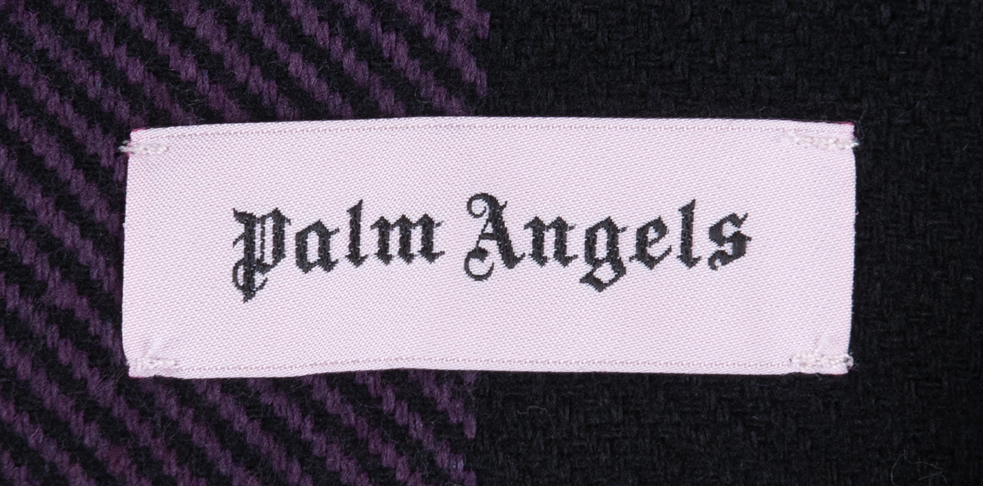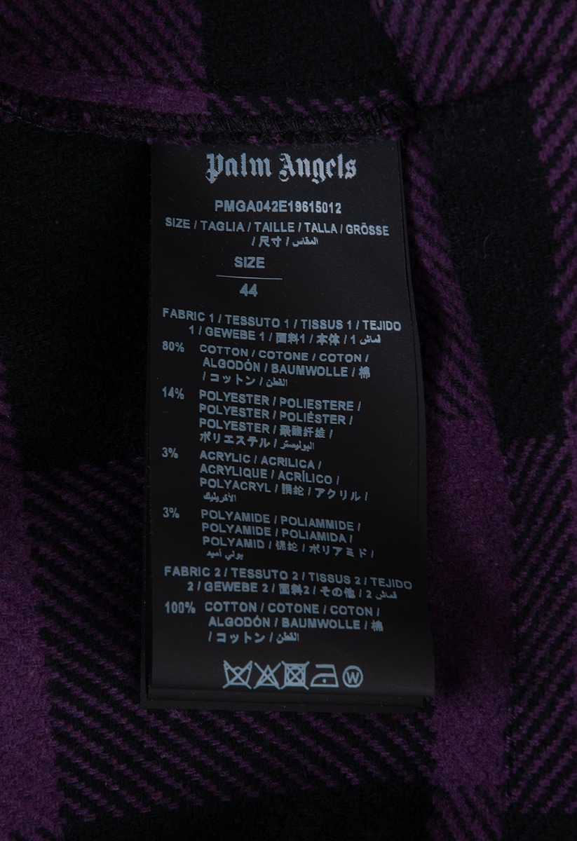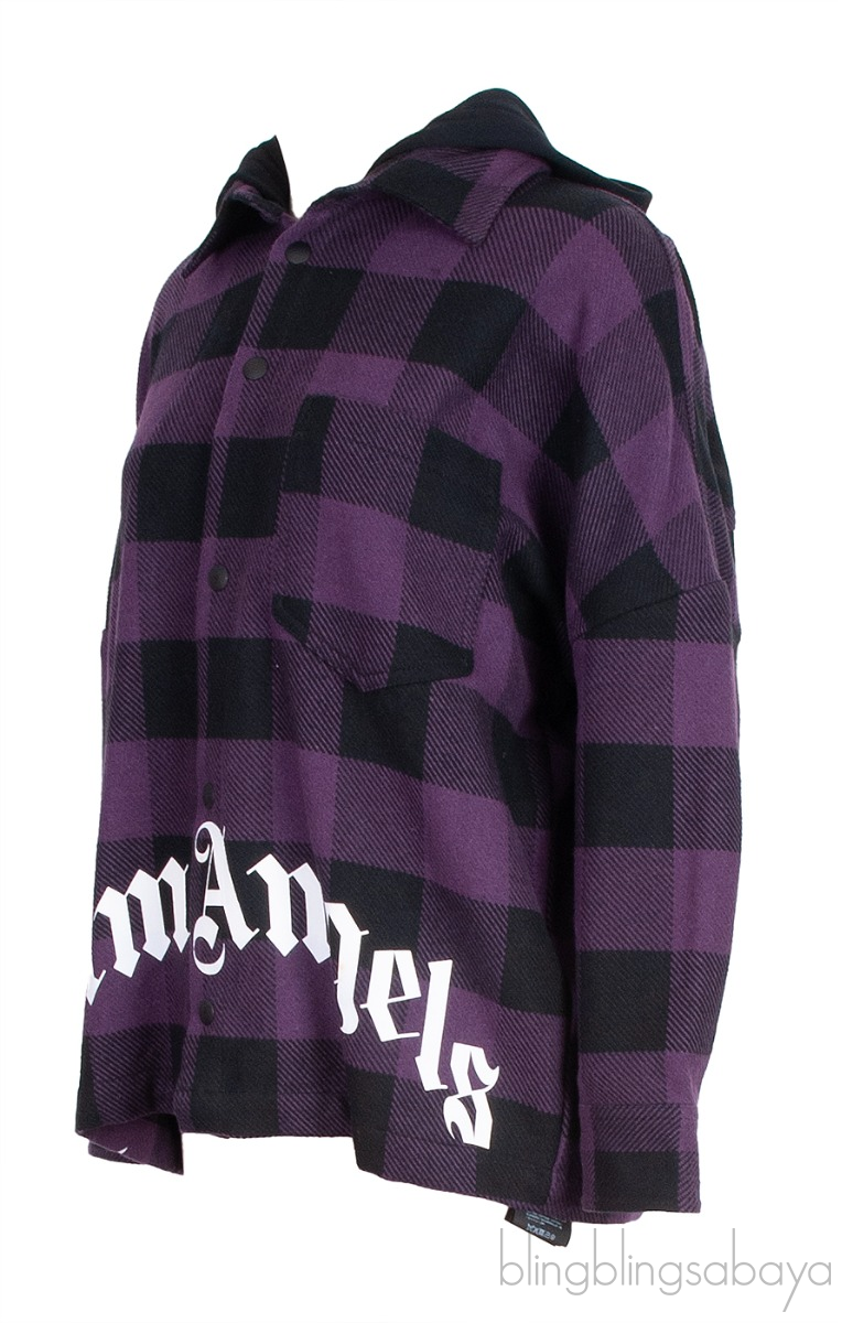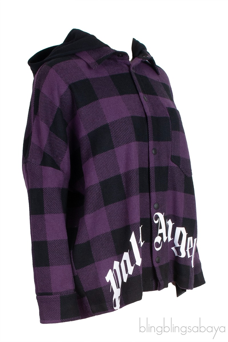 This Palm Angels Purple Check Print Hoodie is crafted from cotton, acrylic, polyester and polyamide purple and black plaid printed fabric. This jacket features a black hoodie, snap fastening at front, long sleeves with buttoned cuffs and has brand printed in white across the front.
