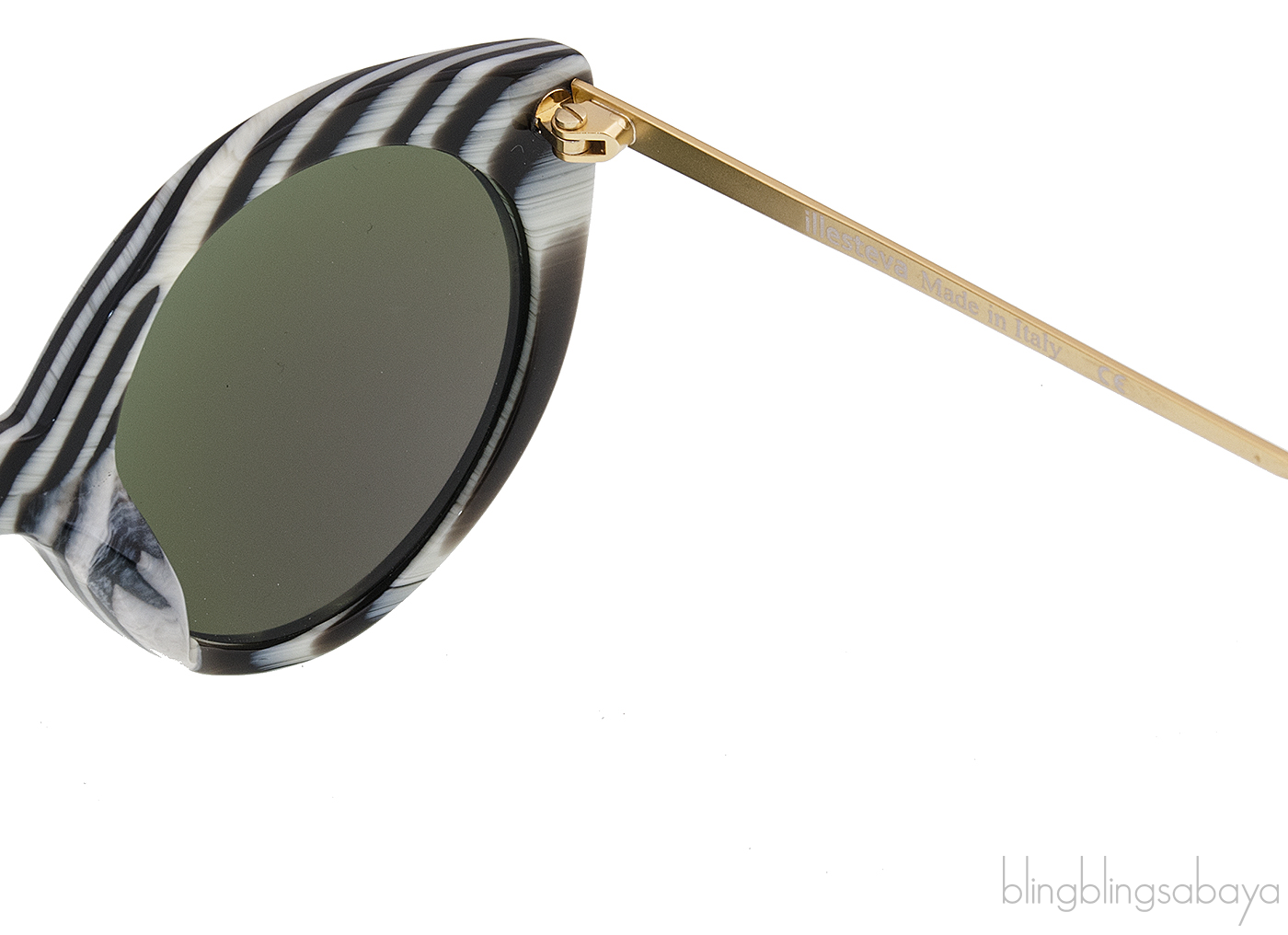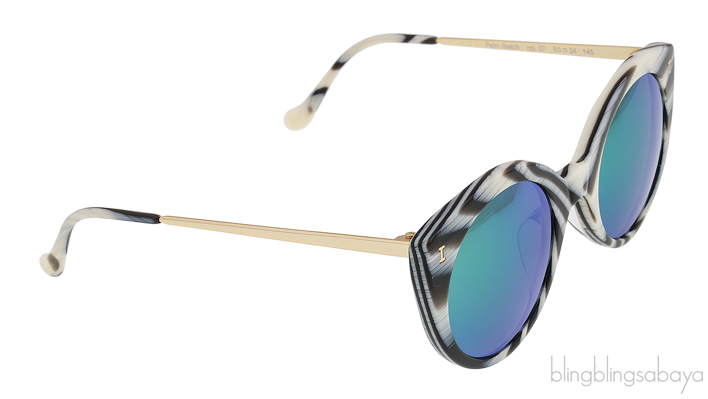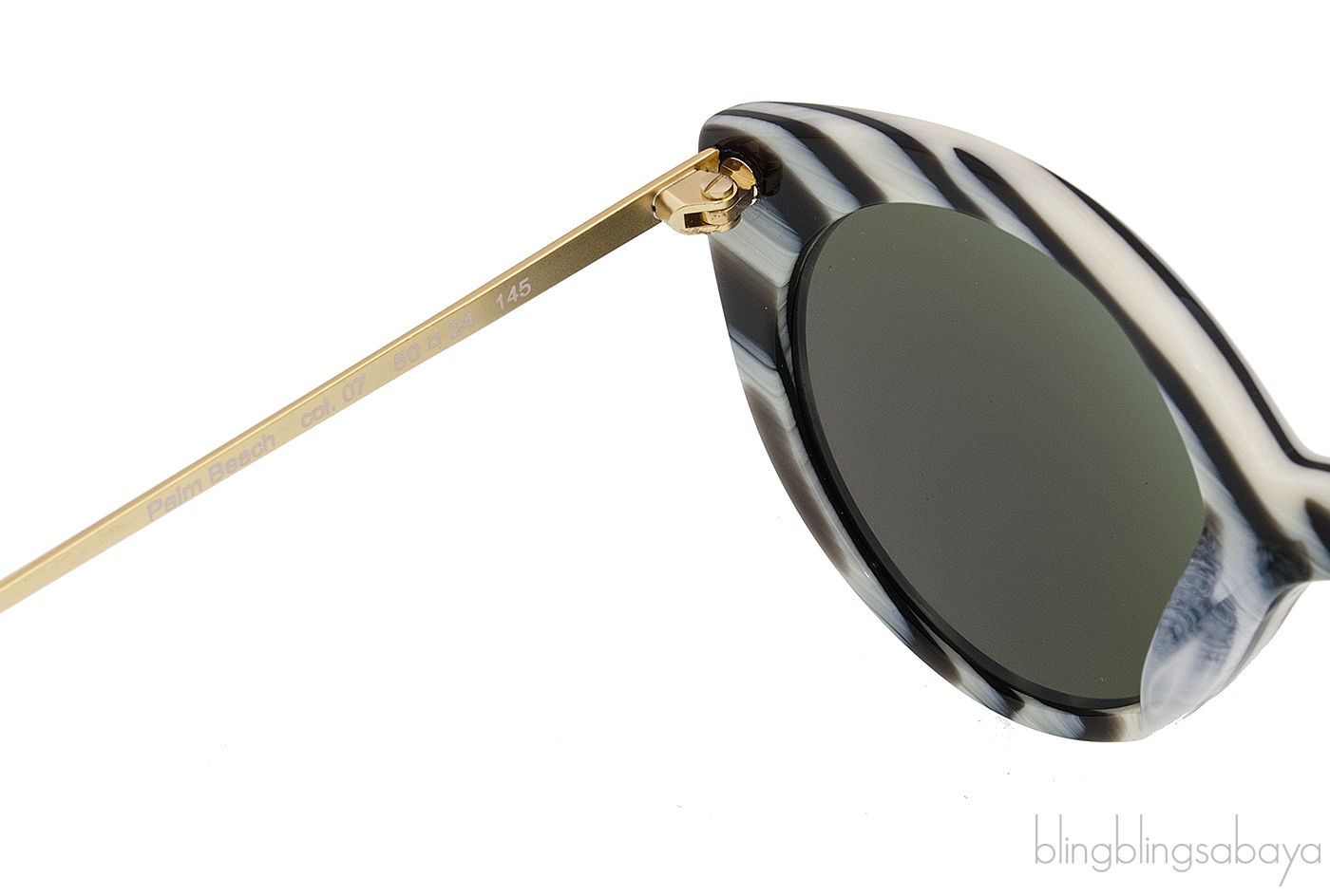This Palm Beach Sunglasses from illesteva is made of horn (black & white) marbleized acetate Palm Beach sunglasses styled with goldtone metal temples. Featuring a rounded cat-eye shape, goldtone metal temples, acetate temple tips and green mirrored CR-39 lenses. UV400. Lens 49mm / Bridge 24mm / Temple 140mm.