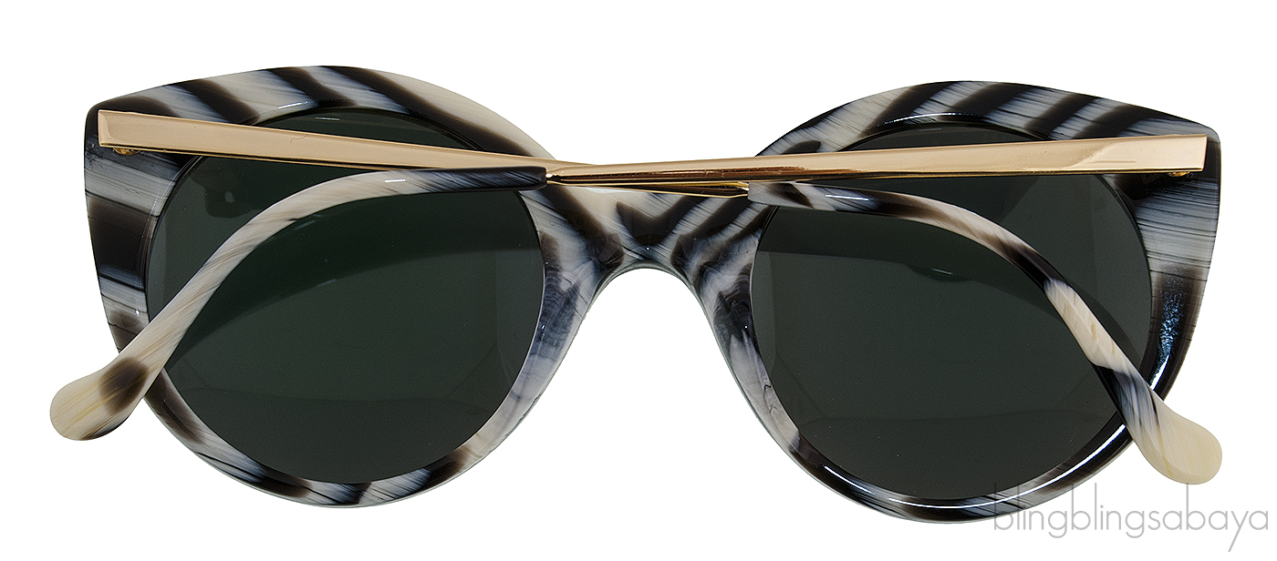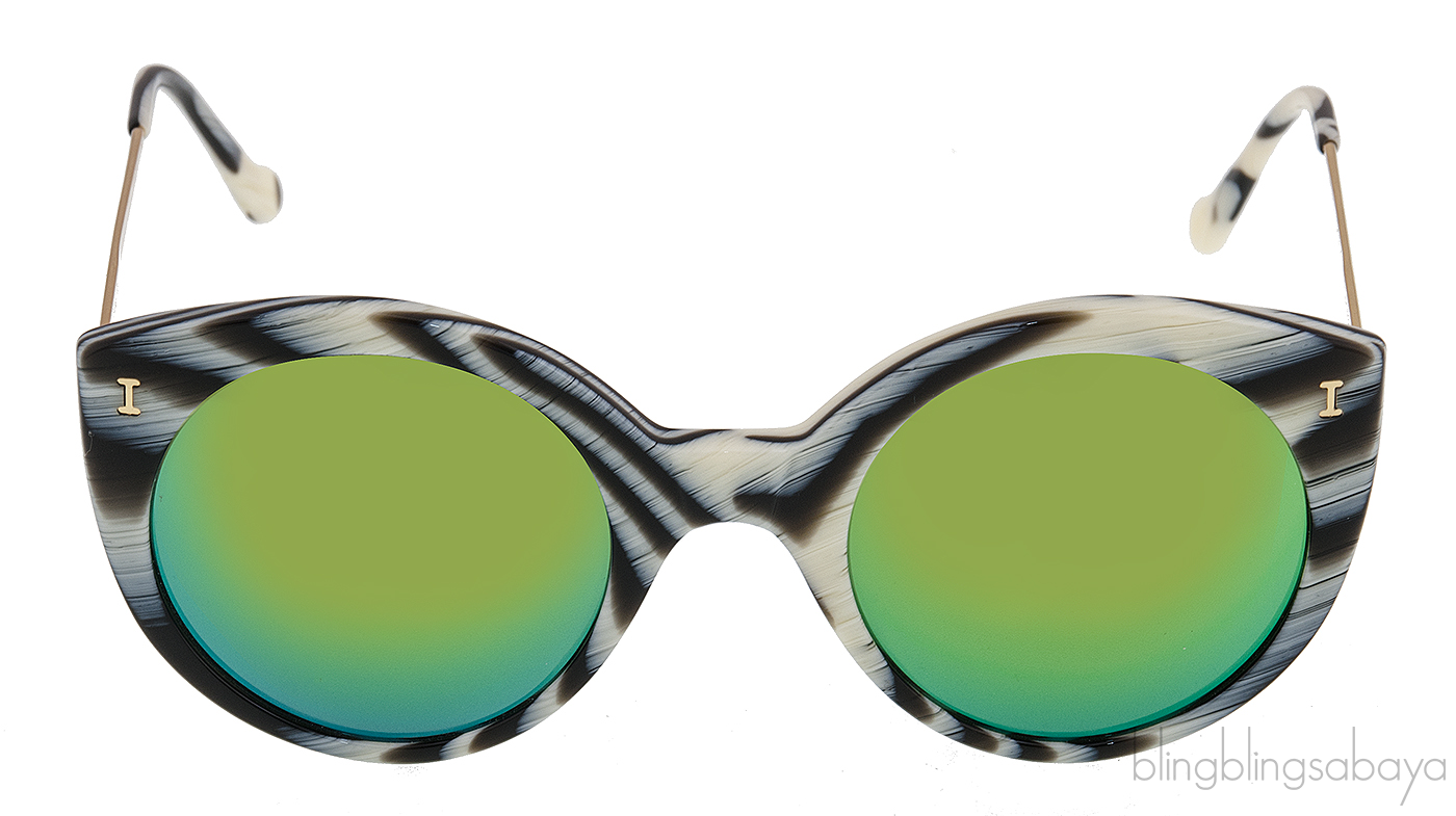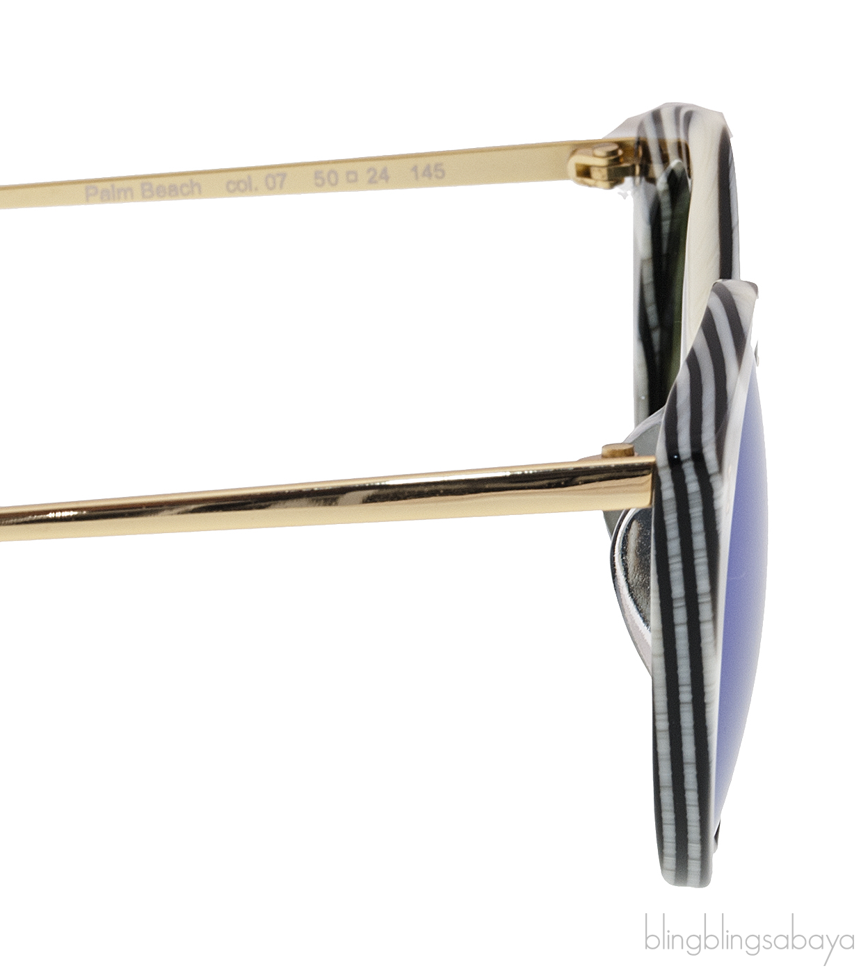 This Palm Beach Sunglasses from illesteva is made of horn (black & white) marbleized acetate Palm Beach sunglasses styled with goldtone metal temples. Featuring a rounded cat-eye shape, goldtone metal temples, acetate temple tips and green mirrored CR-39 lenses. UV400. Lens 49mm / Bridge 24mm / Temple 140mm.