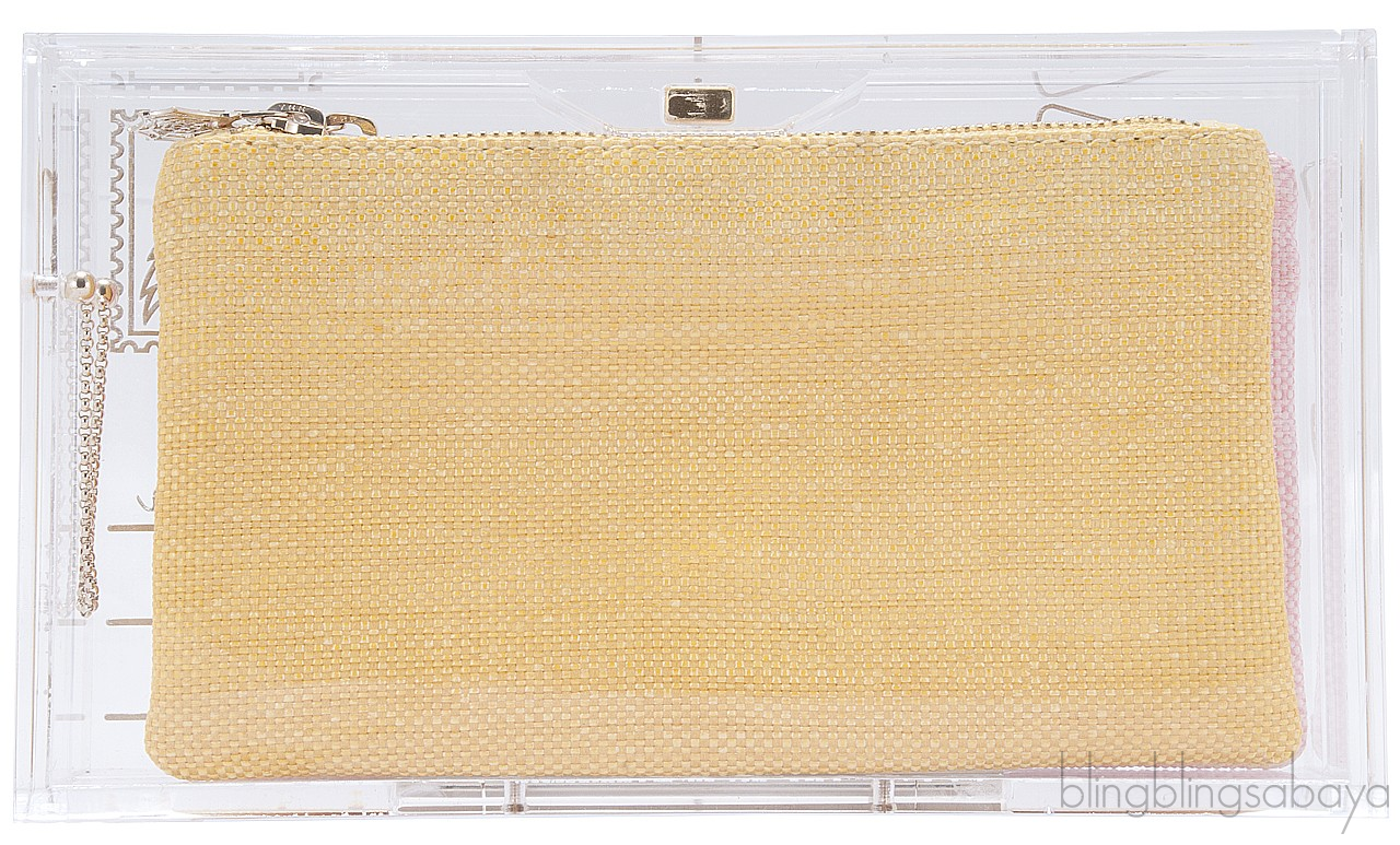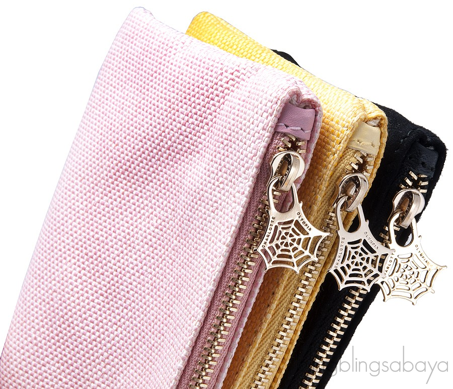 This clutch comes in three inserible pouches in Yellow, Pink & Black colors depending on your mood. Pouches are made of fabric and secure on a zip closure with surprising spider web gold metal pulls.