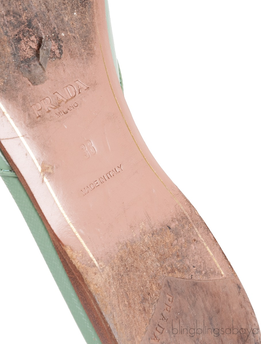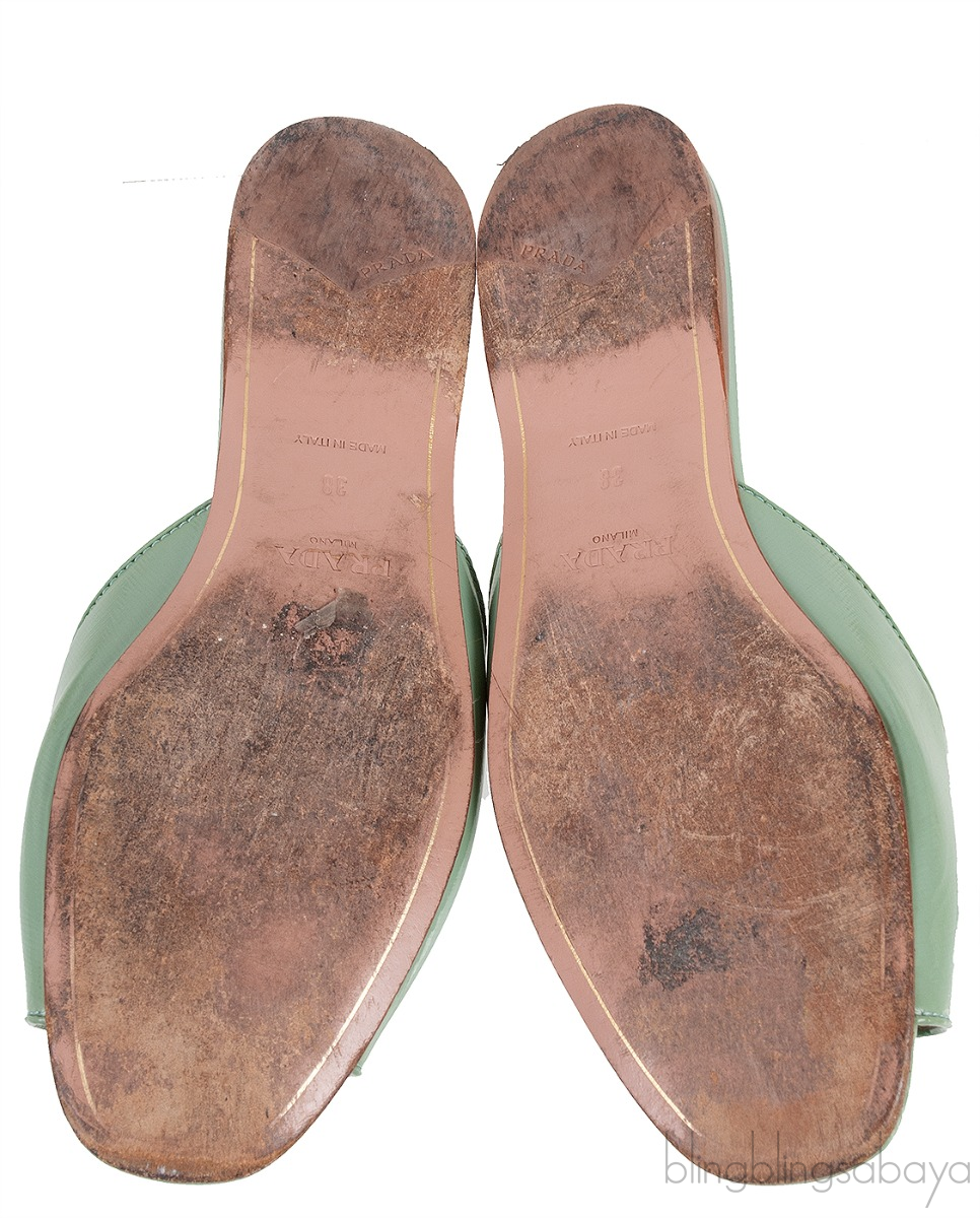 These Pastel Green Print Open Toe Slide Sandals from Prada are crafted in pastel green saffiano leather upper with beige leather lining. Featuring a leather lined sole and insole, open toe and crystal embellishment on the vamp.