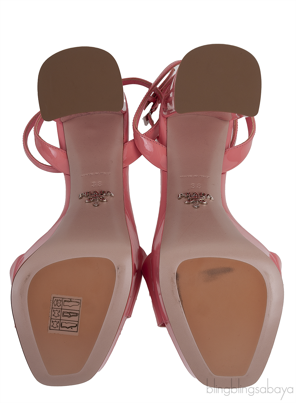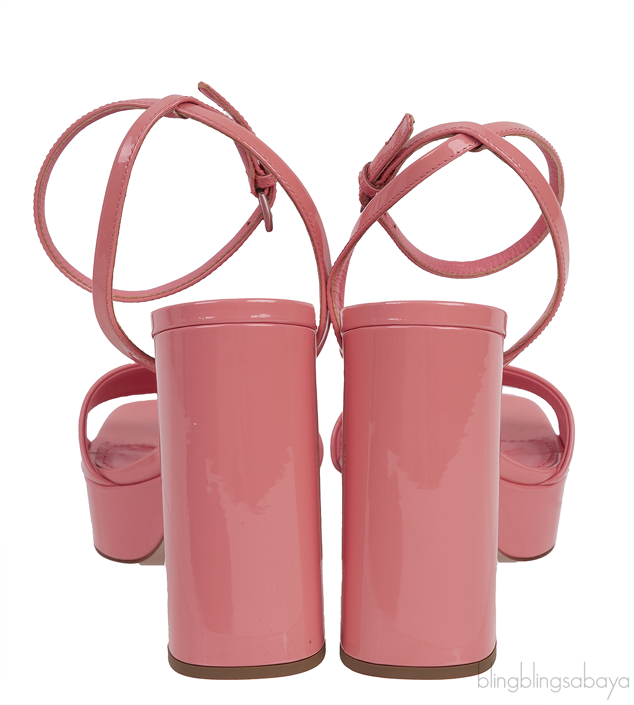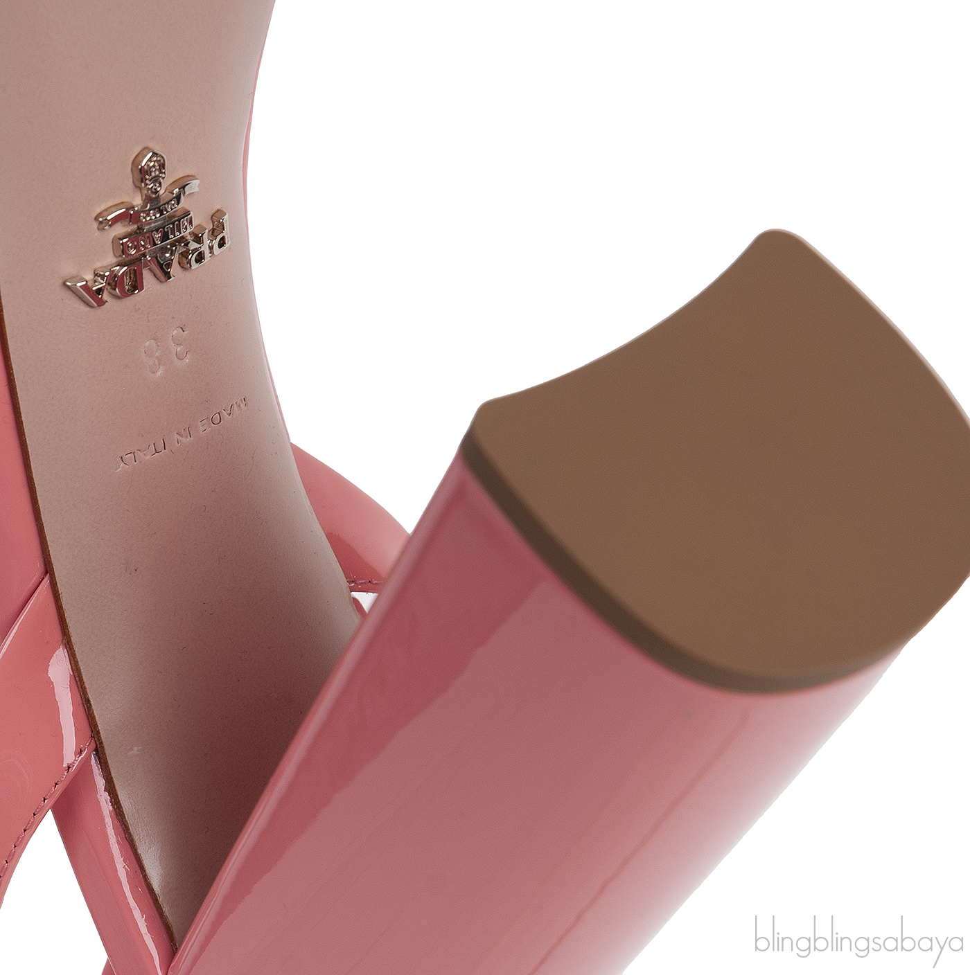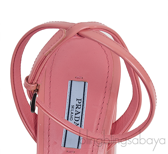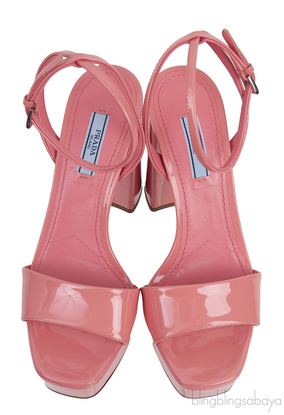 These Patent Leather Platform Slingback Sandals from Prada are crafted from coral pink patent leather upper with leather lining. These sandals features a peep square toe, leather lines insole, ankle strap wth silver buckle fastening, and stack heels measuring 120 mm high.
