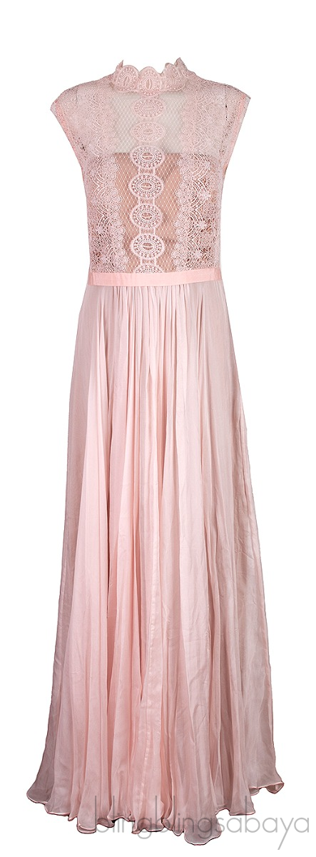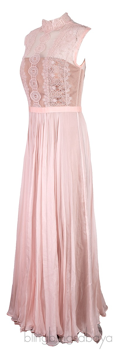 This Peach Lace Sleeveless Dress from Catherine Deane is crafted from 100% Polyester at top and 100% Silk at the bottom; Lined 100% Polyester. This dress features partially sheer at top with close scallop neckline, sleeveless, zip fastening at rear and maxi skirt.