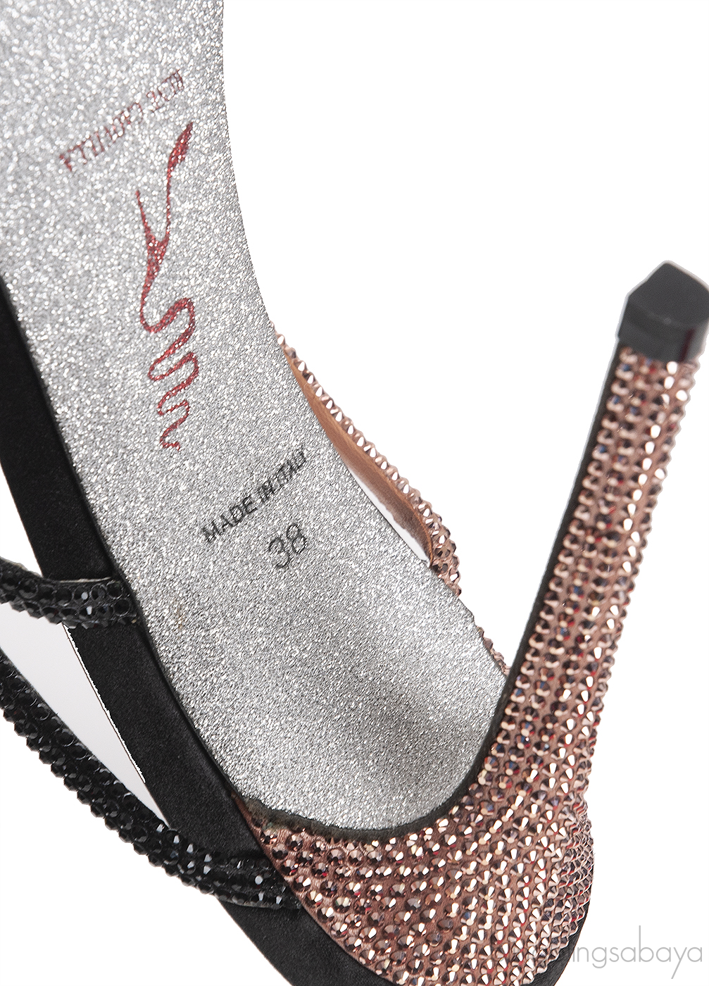 These Pearl & Rose Gold Crystal Black Satin Sandals from Rene Caovilla are crafted from satin, leather and crystals. These sandals features a strappy upper with black and rose gold crystals embellishment, white pearl, an almond peep toe, leather lined insole, glittery sole and 100 mm high heels fully encrusted with rose gold crystals.