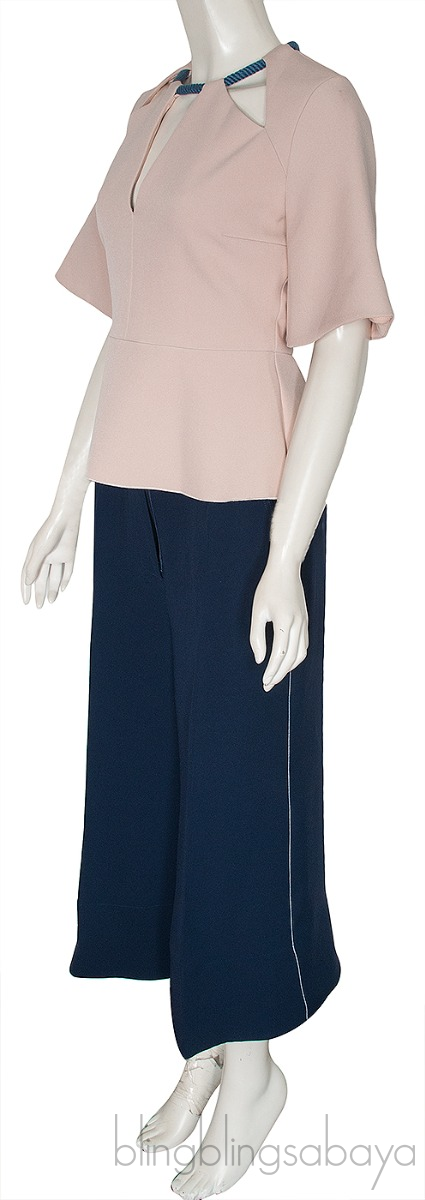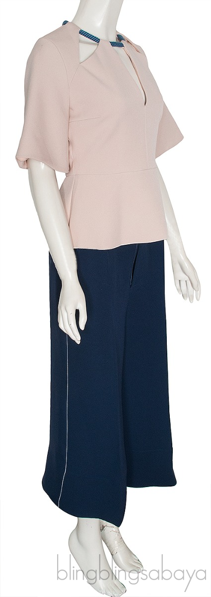 Peplum Blouse & Blue Wide Leg Trouser from Roksanda! Top is crafted from 97% Polyester and 3% Elastane featuring a cut-out design, rope detailing at neckline, short sleeves, peplum cut and zip fastening at back.