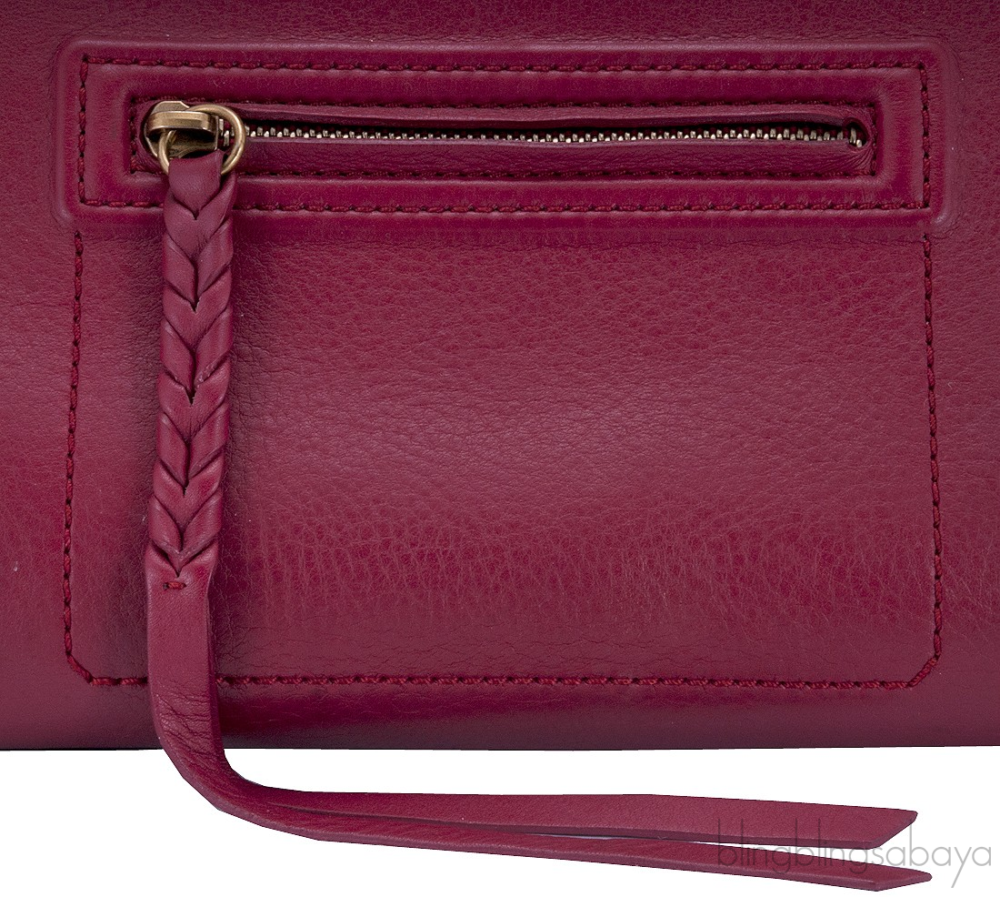 This classic handbag features a super cute zip pocket in a front with long braided leather pulls. It has two rolled leather handles and has open top with a strap that can be tighten to secure the bag. Interior is lined with smooth suede leather featuring one roomy compartment and one zippered pocket.