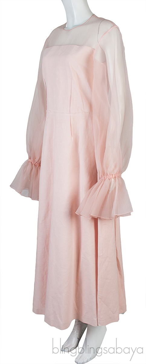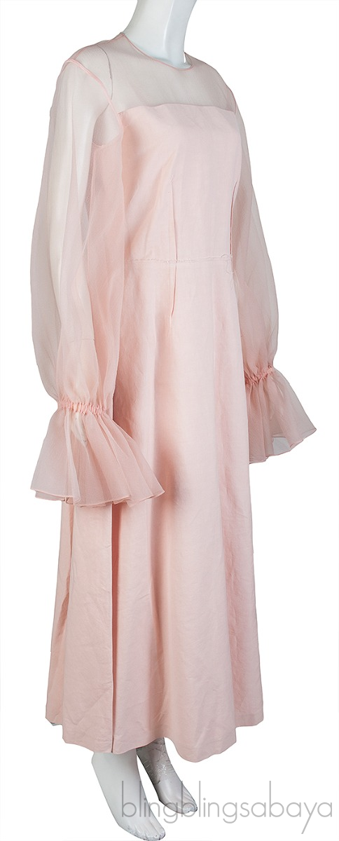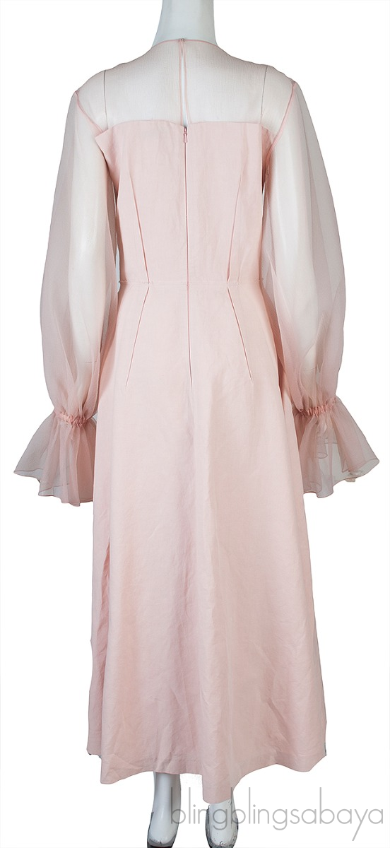 This Pink Blush Lois Dress from Rejina Pyo is crafted from 49% Cotton & 51% Linen; Sleeve 100% Polyester Lining 100% Polyester. This dress features a luxurious blush-nude crêpe and organza with oversized sleeves, finished with an elasticated ruffle cuff detail, concealed center back zip and gathered fabric construction at the waist.