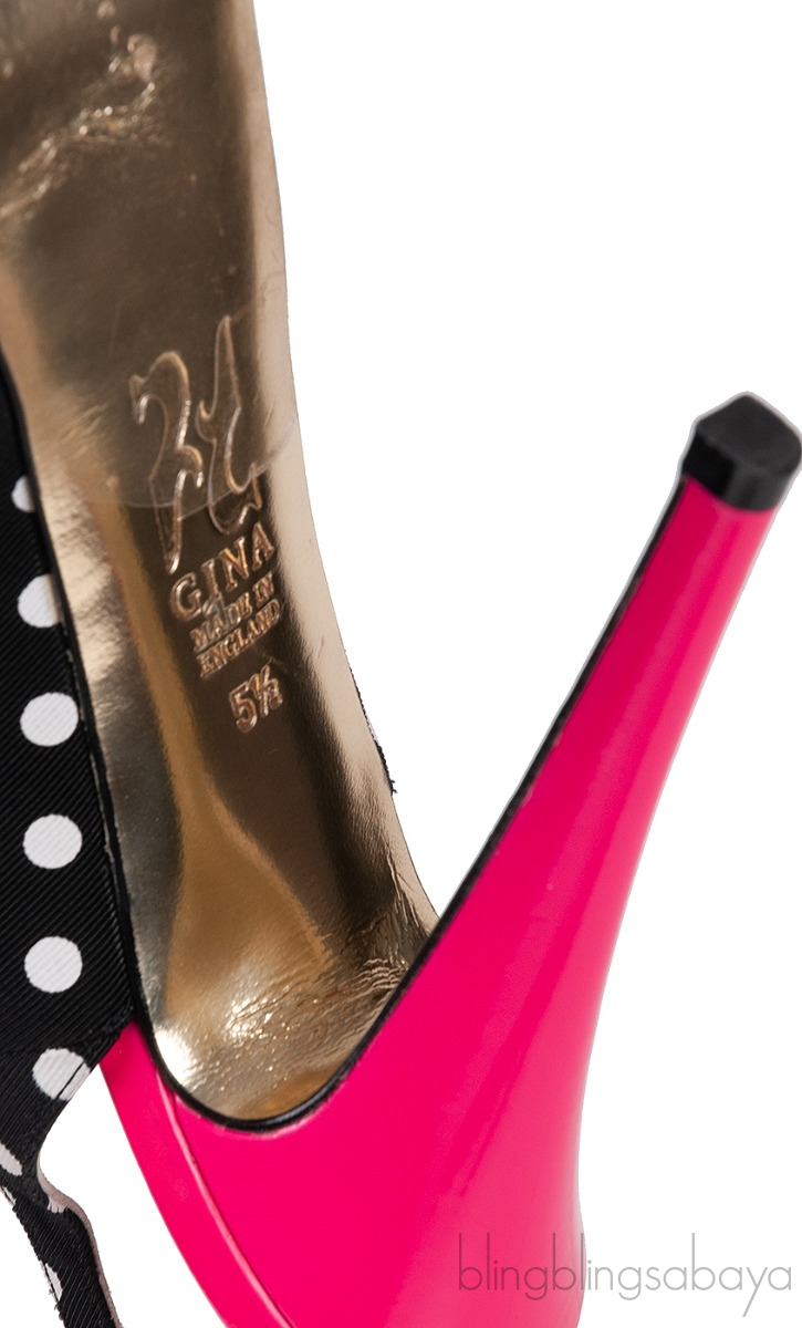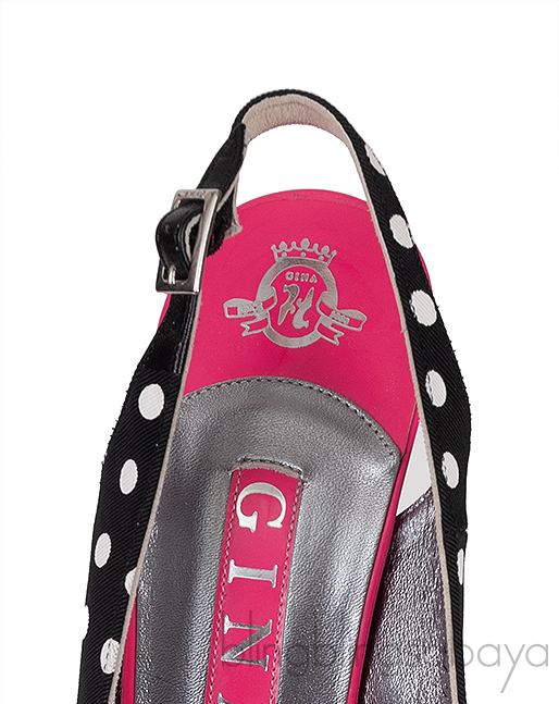 These Pink Bow Black Polka-dot Platform Slingback Shoes from Gina are crafted from black & white polka-dot upper, neon pink leather bow and silver leather lining. These heels features a peep almond toe, leather lined insole, silver buckle fastening, leather sole and neon pink heels measuring 120 mm high.