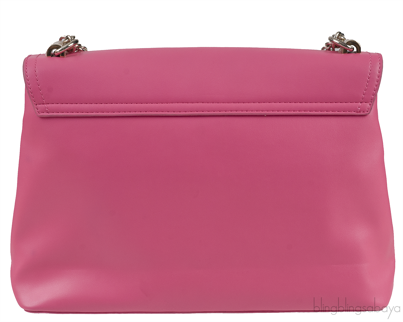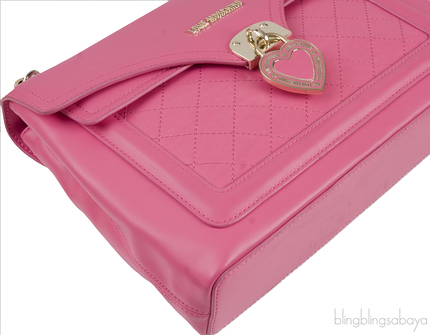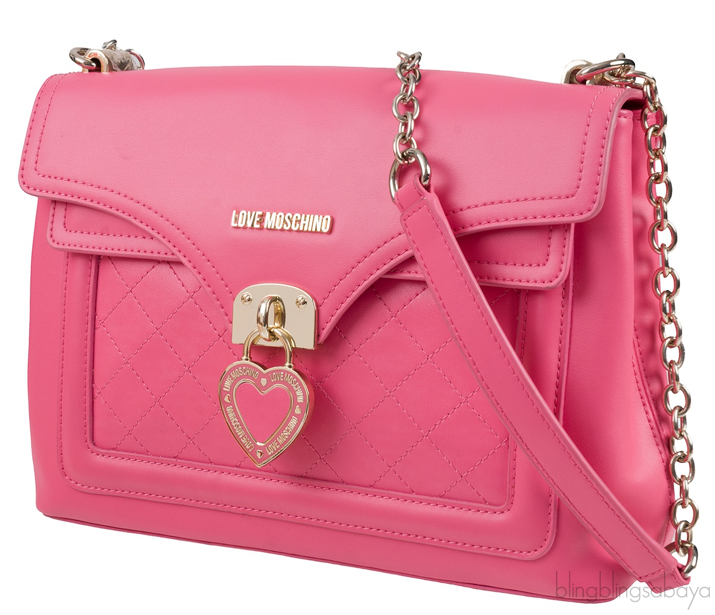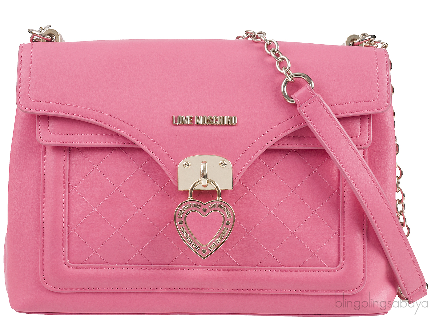 This Pink Flap Shoulder Bag from Love Moschino is crafted from Pink leather accented with the gold hardware. This bag features a love moschino metal logo2 and heart charm dangling on the front magnetic flap cover. It has a quilted pocket at front and long shoulder chain strap with leather pads.