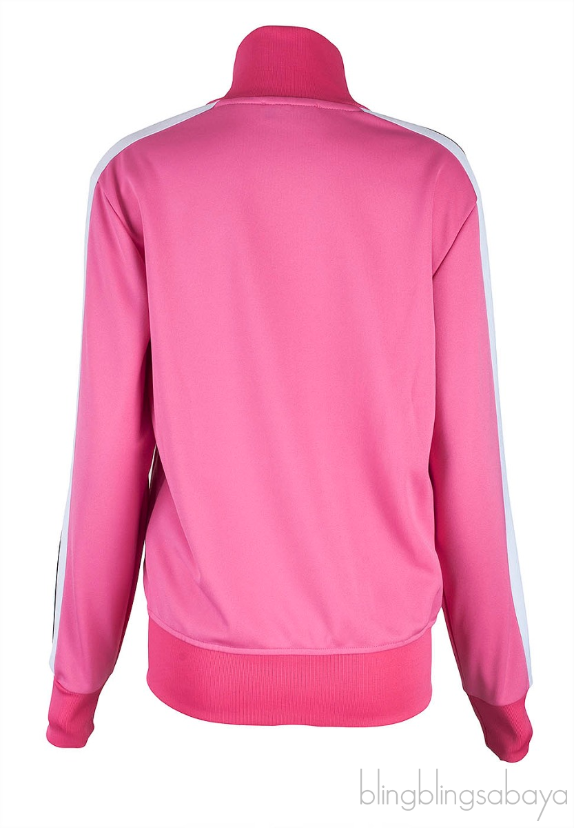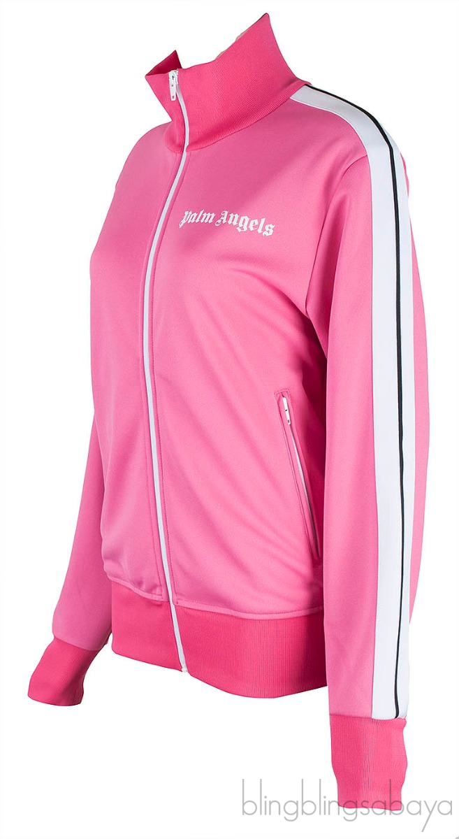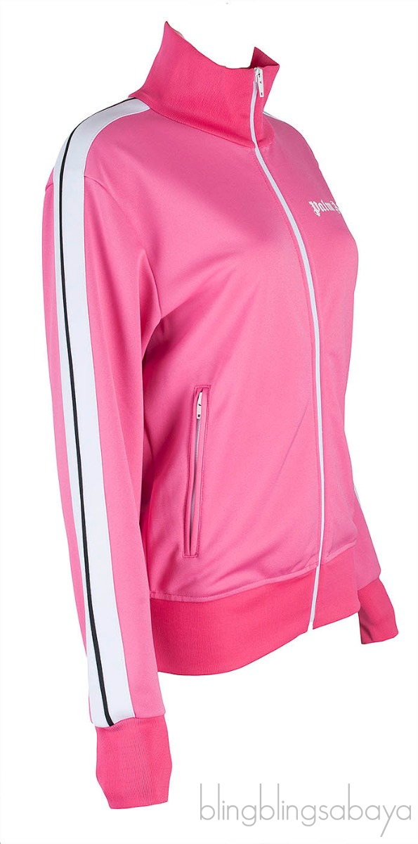 This Pink Jersey Track jacket from Palm Angels is crafted from 100% Polyester. This pink jersey jacket features a white zip-up closure, long sleeves with white and black stripes, zip side pockets and white logo2 on front chest.
