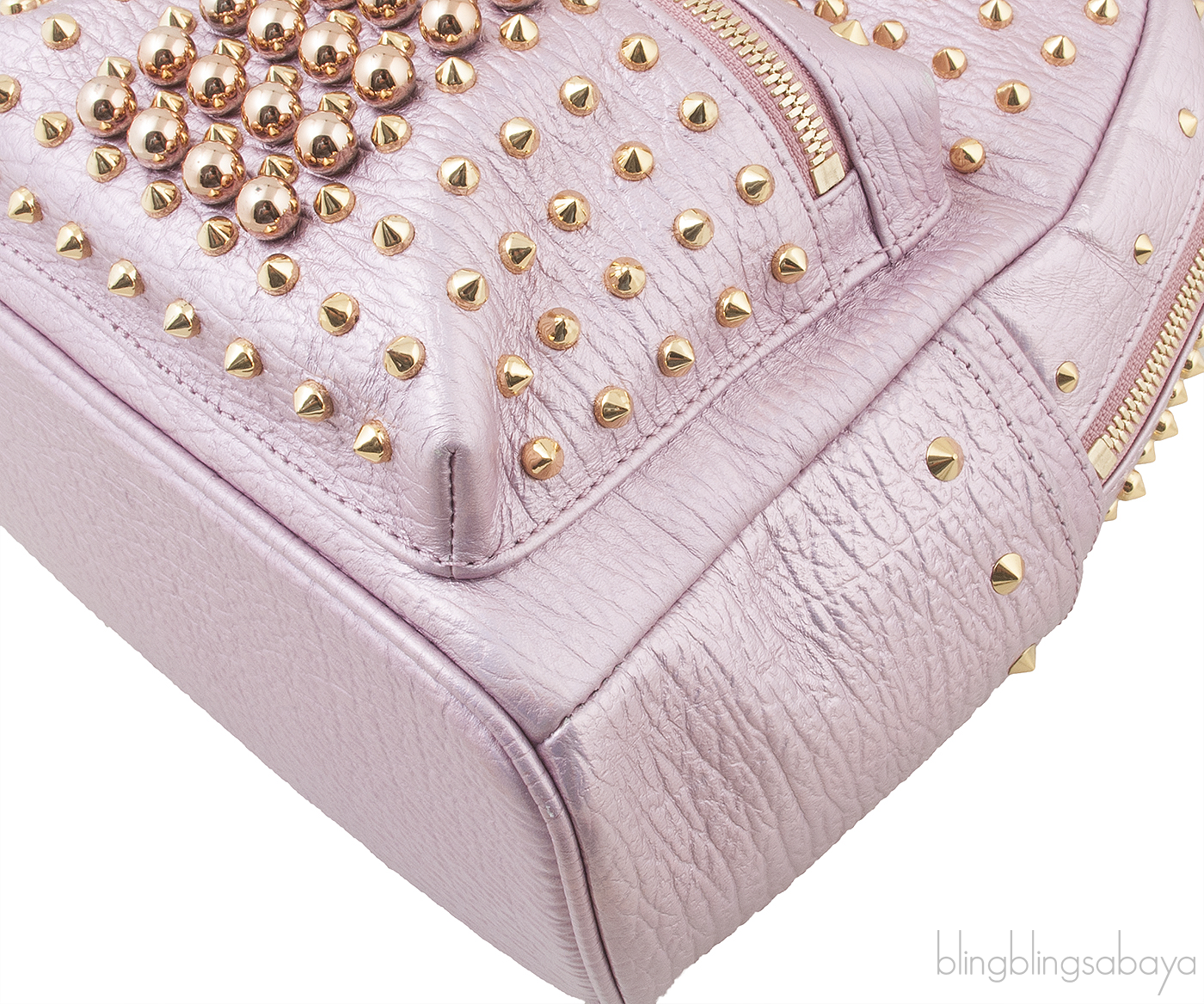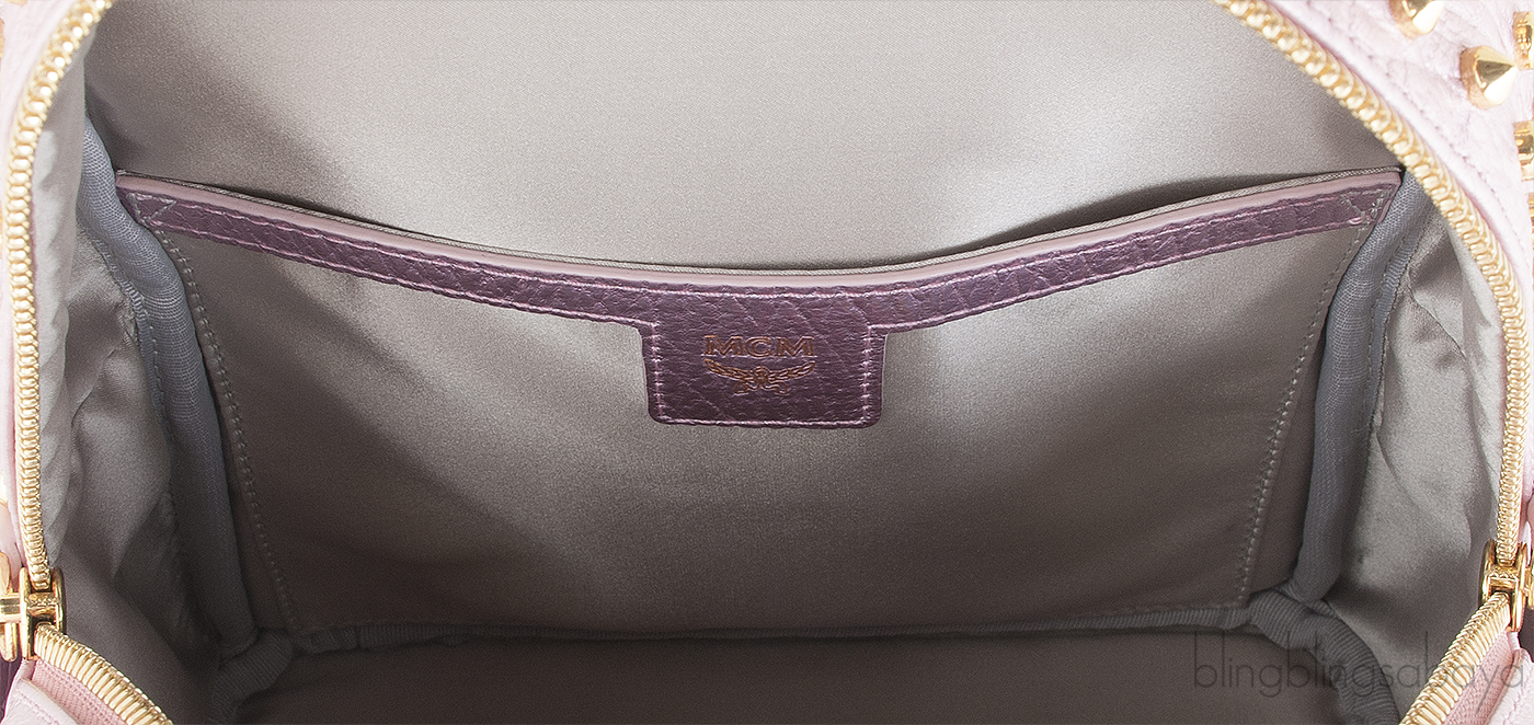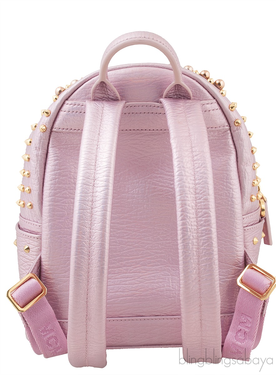 This Pink Metallic Embellished Backpack from MCM is crafted from light pink metallic leather accented with the gold hardware. This chic studded bag is embellished with rose gold beads and gold studs and gold logo2 metal plate at front.