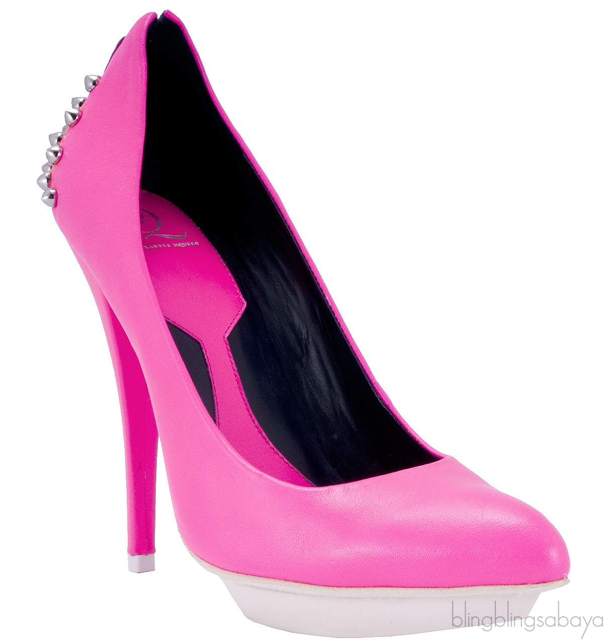 This Pink Studded Neon Leather Pumps from Alexander McQueen is crafted in Neon Pink Leather upper with black leather lining. This features a pointed toe, stilleto heel measuring 125 mm, 15 mm island platform and silver studs deatiling on the heel counter.