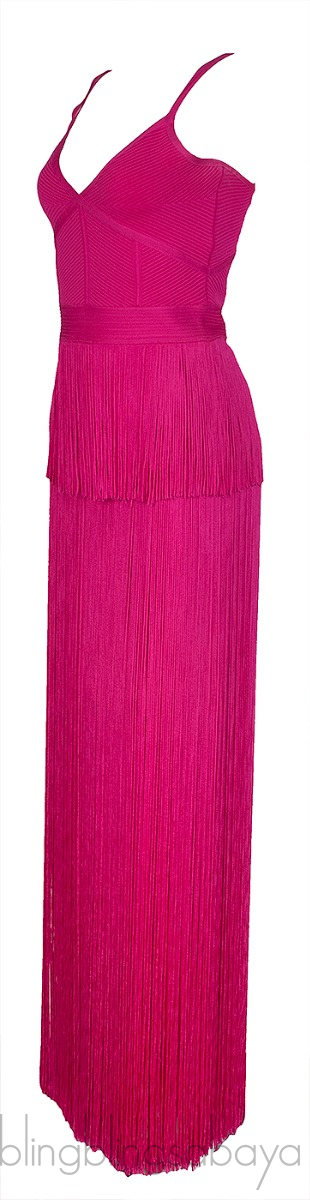 This Fuchsia Pink Layered Fringed Dress from Herve Leger is crafted in 96% Rayon, 3% Nylon & 1% Spandex in fuchsia pink hue. This fress features a v-neckline, shoulder straps, sleeveles, zip fastening at rear and layered fringed skirt.