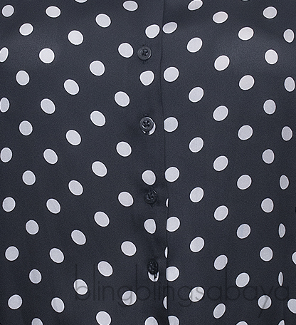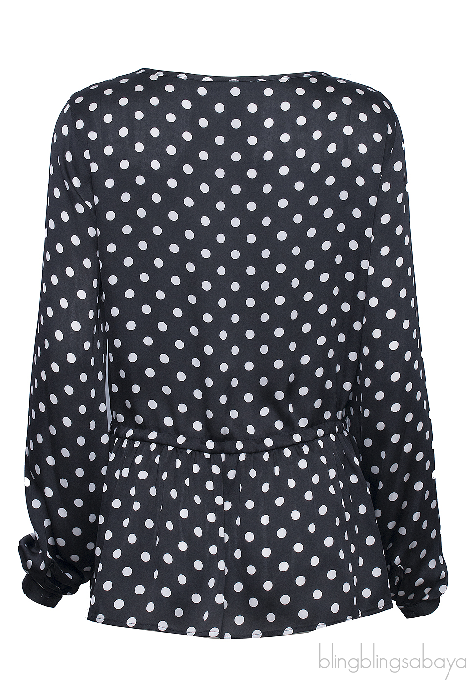 This Polka Dot Peplum Blouse from Ralph Lauren is made of 100% Polyester in black with white polka dot. Featuring a round neckline, button fastening at front, long sleeves with button cuffs, peplum hemline with string fastening.