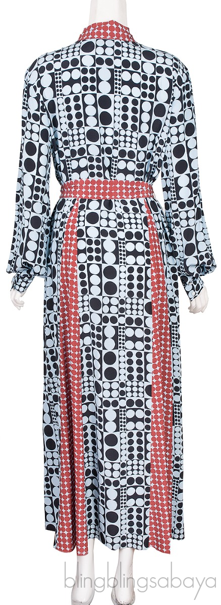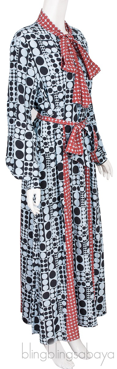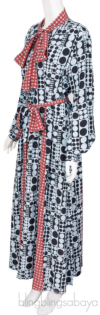 This Polka Tie Neck Godet Dress from Arias New York is crafted from 100% Silk fabric. This dress features a polka dot design all-over, v-neckline, long sleeves with buttoned cuffs, tie neck printed with contrasting red polka and maxi length.