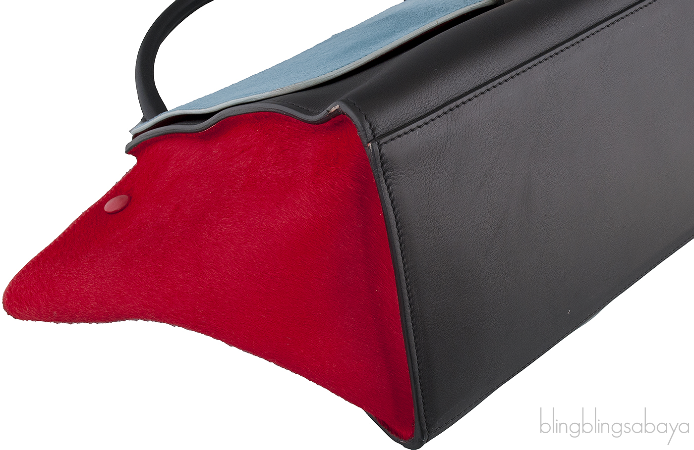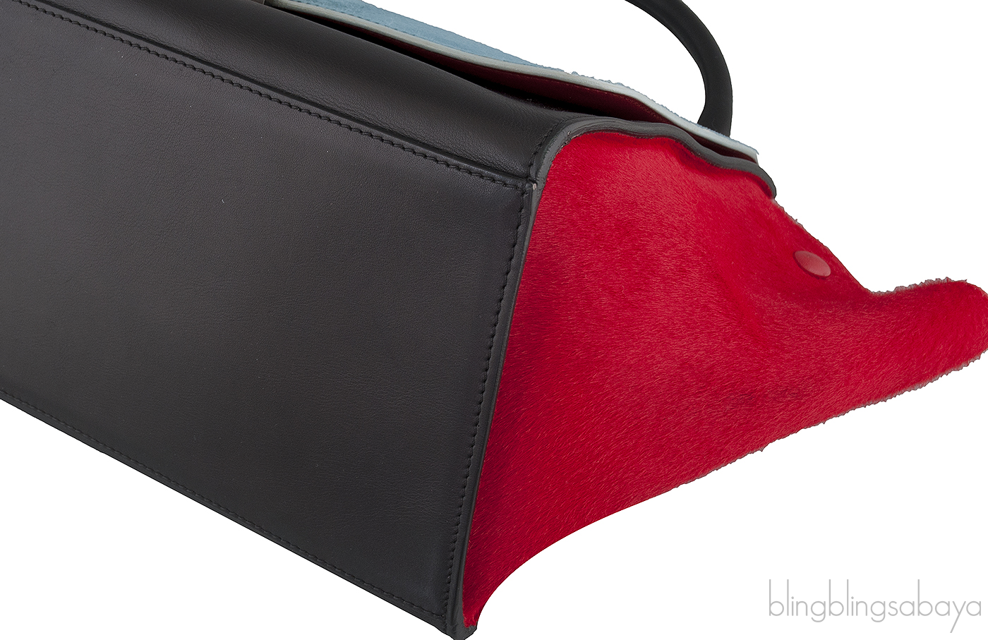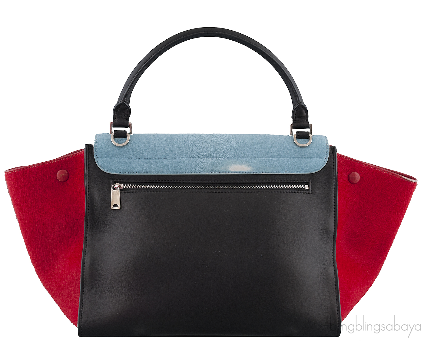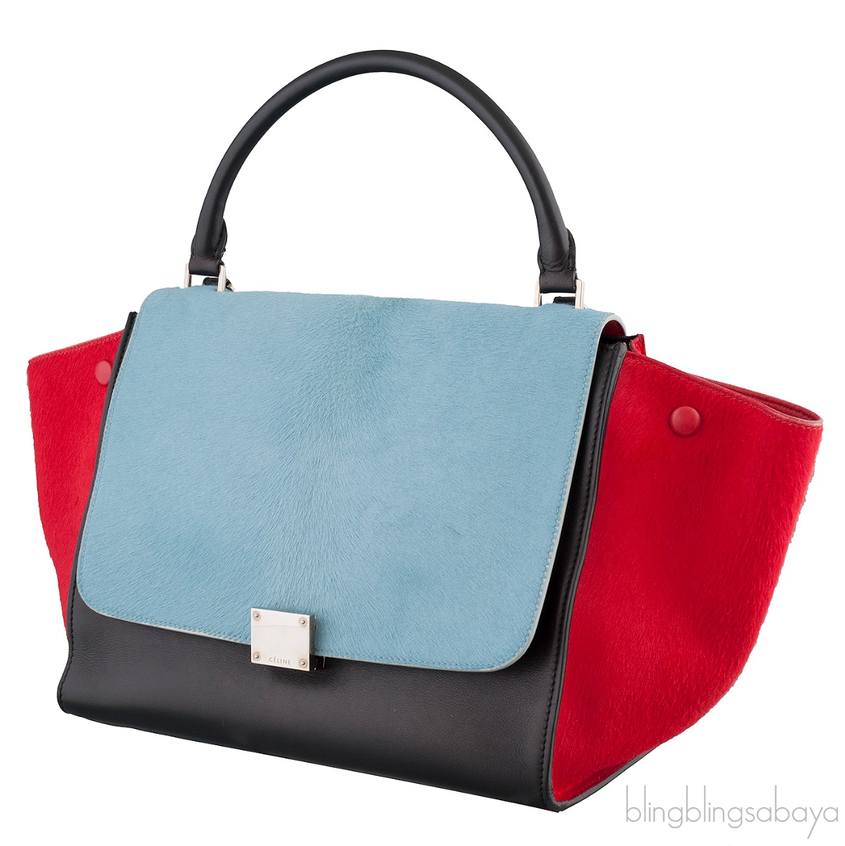 This Tri-color Trapeze Luggage from Celine is made in two different leathers and three stunning, classic color combination that will go with everything in your wardrobe. The bag front, back and handle are made of calfskin leather in a elegant black hue with pony hair teal flap cover and red pony hair leather wings.