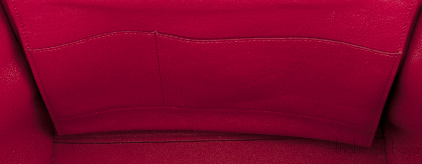 This bag is accented with a gold hardware and has a single handle.The bag also features one zippered pocket on the back side and the top zip opening reveals a very roomy interior lined with leather featuring two open interior compartments.