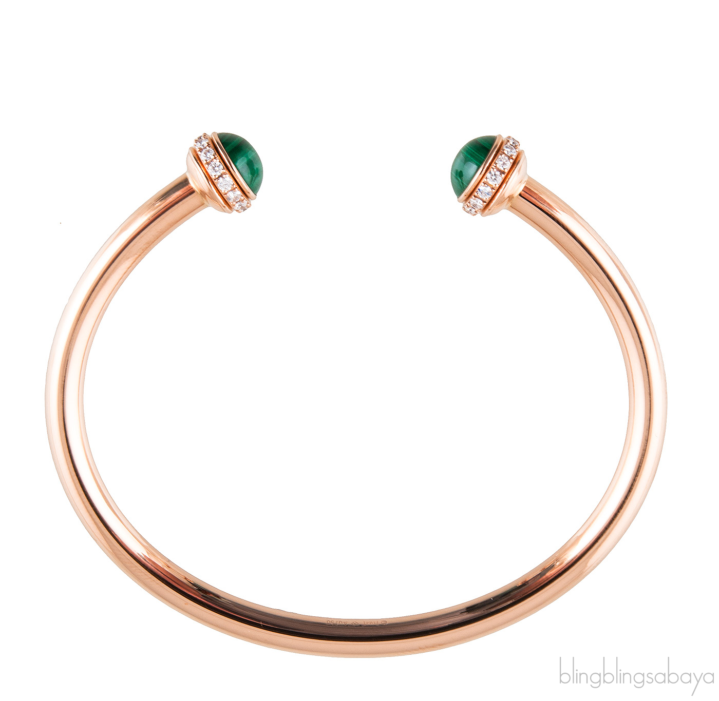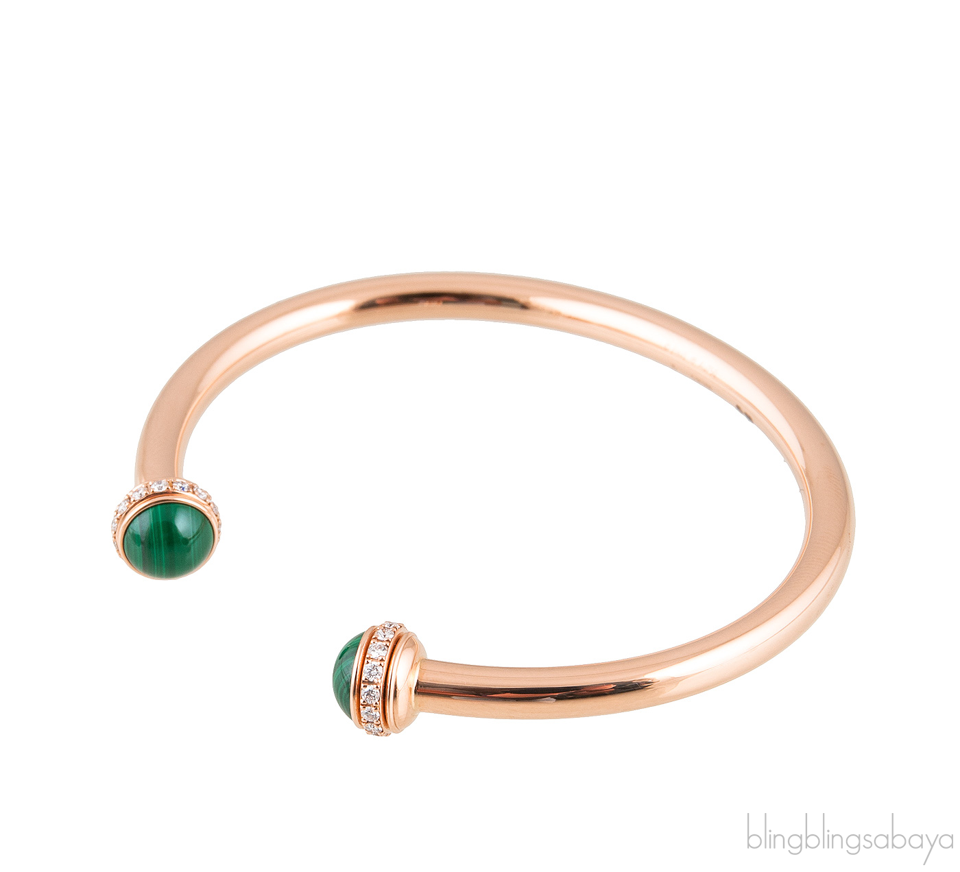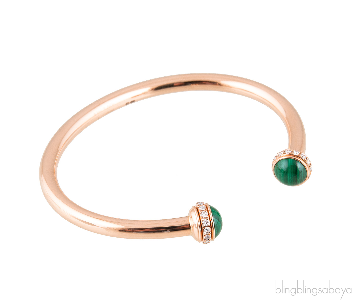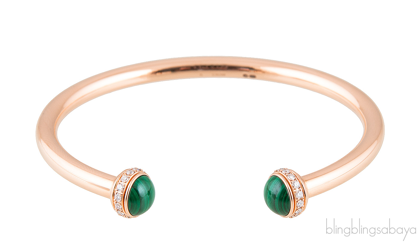 This Possession Open Bangle Bracelet from Piaget is crafted is preciously crafted in in 18K rose gold, set with 30 brilliant-cut diamonds (approx. 0.38 ct) and decorated with two malachite cabochons on both edges.