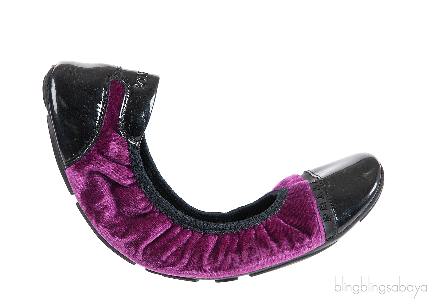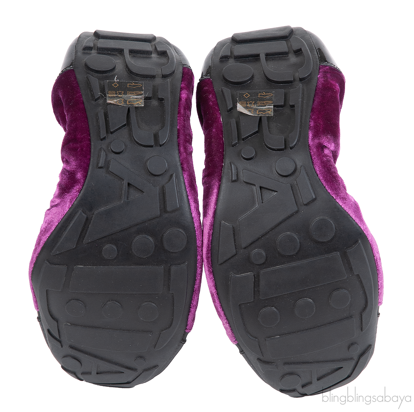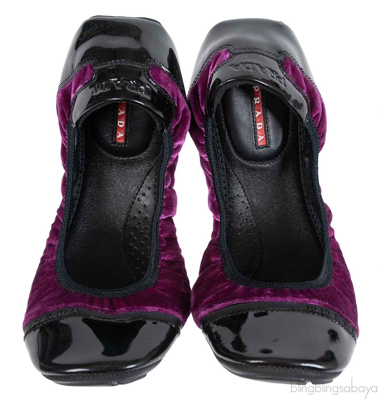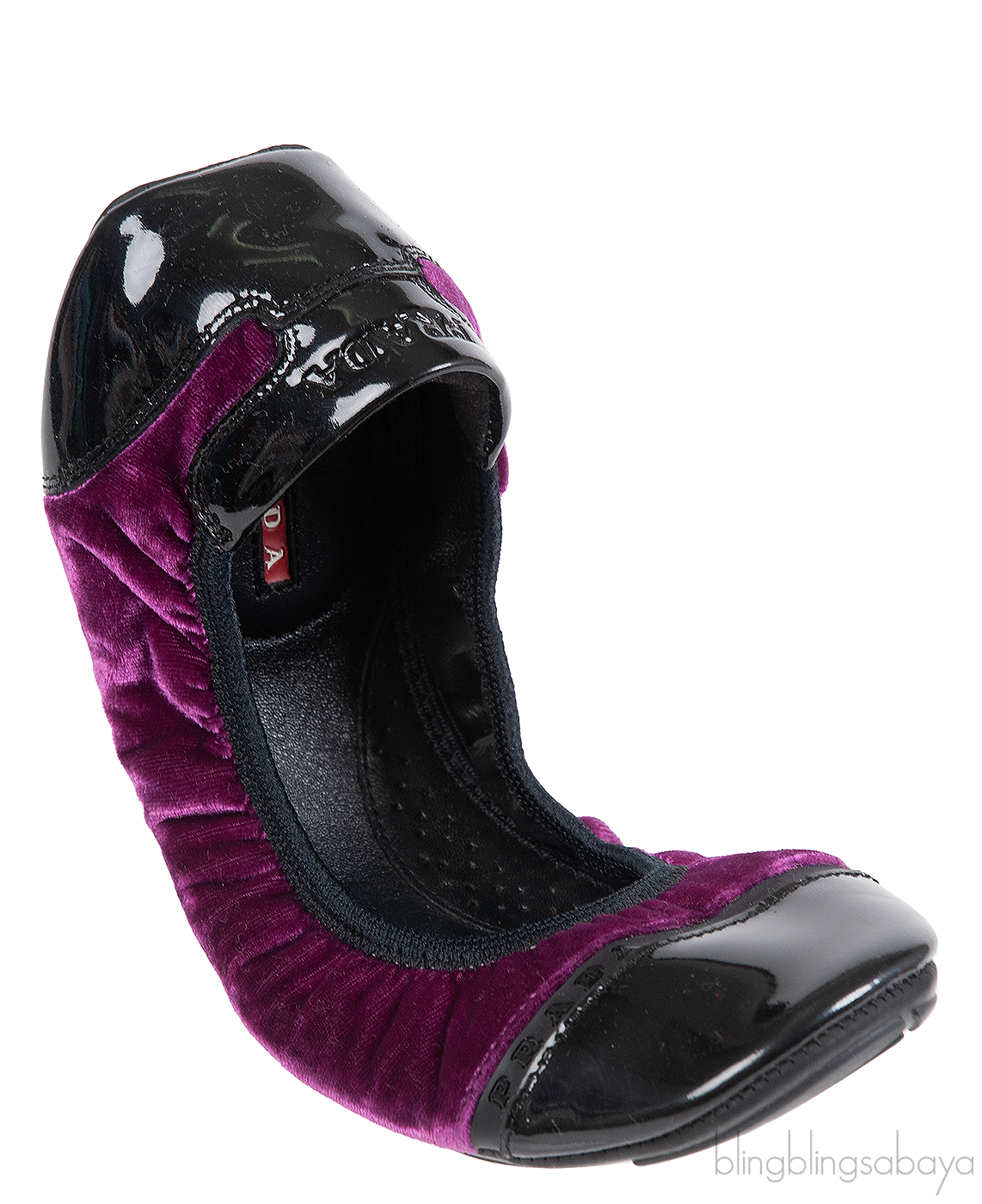 This comfortable Sport Velvet Ballet Flats from Prada features a violet velvet fabric with Square patent cap-toes, it has a rubber logo2 stripes at the toes, logo2 imprinted patent trim at the heels and elasticized openings. The Leather padded insoles are accented with Prada Sport logo2s. The soles are made from rubber.