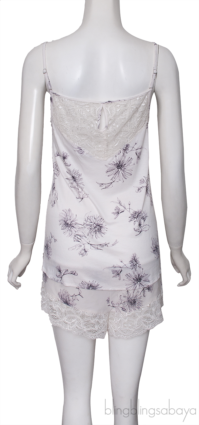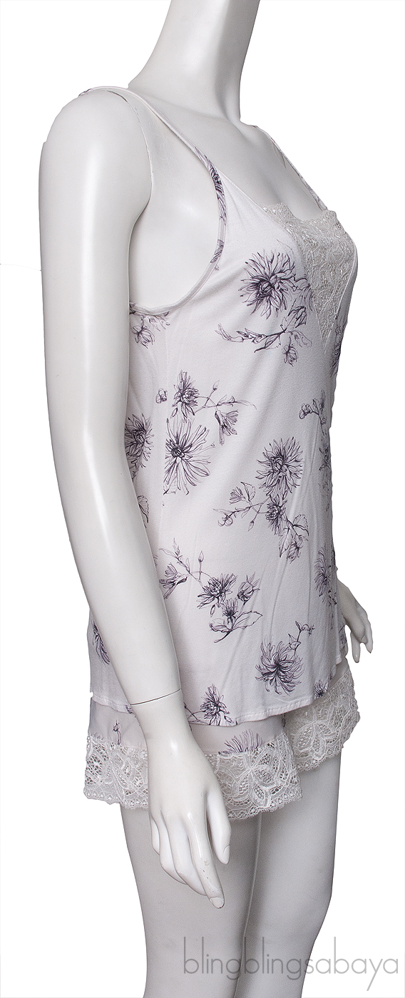 These Printed Tank Top & Panty from Hanro are crafted polyamide elastane fabric in off-white with purple floral print. Tank top features a square neckline, spaghetti strap, lace panel and paired with lace trimmed panty.
