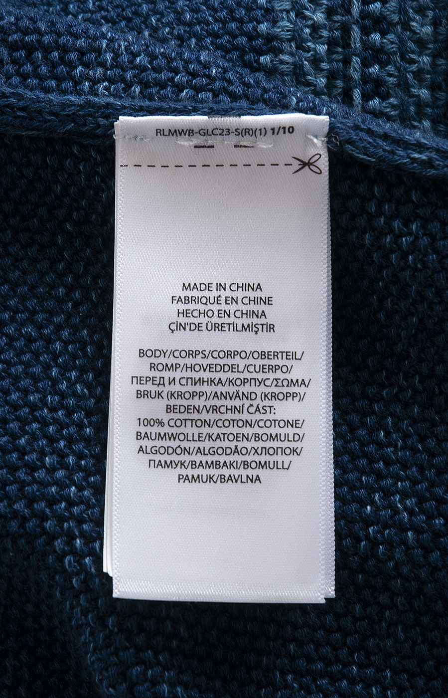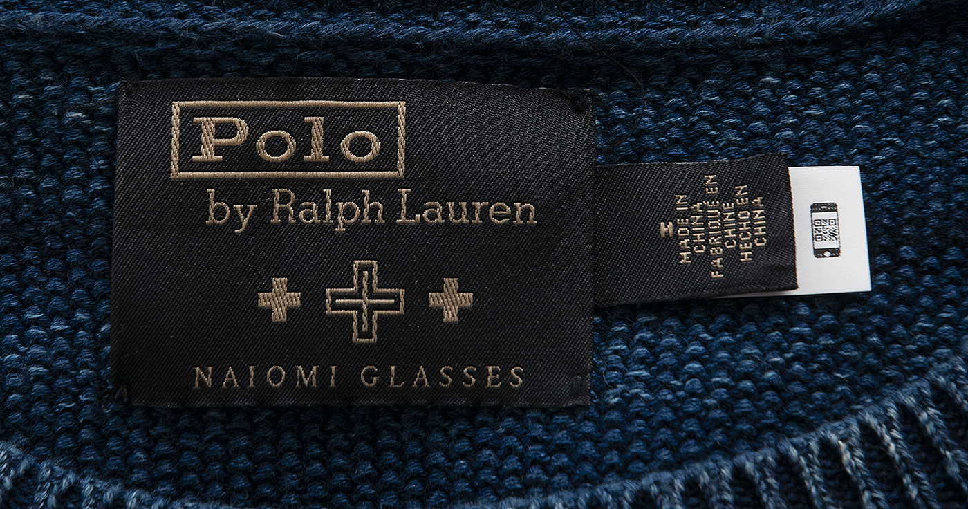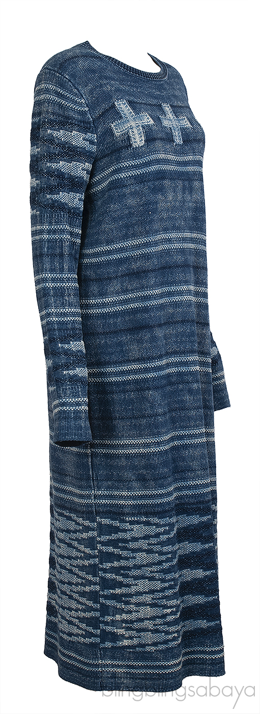 This PRL x Naiomi Glasses Blue Knit Jumper Dress is made from cotton with a texture that looks like traditional woven fabrics. It's dyed with real indigo, giving it a rich color with natural light and dark shades. The design includes intarsia-knit four-directional crosses and a wedge-weave pattern. In Navajo and other Native cultures, the four-directional cross and the number four are important symbols, representing the four directions of the Earth and the stars.