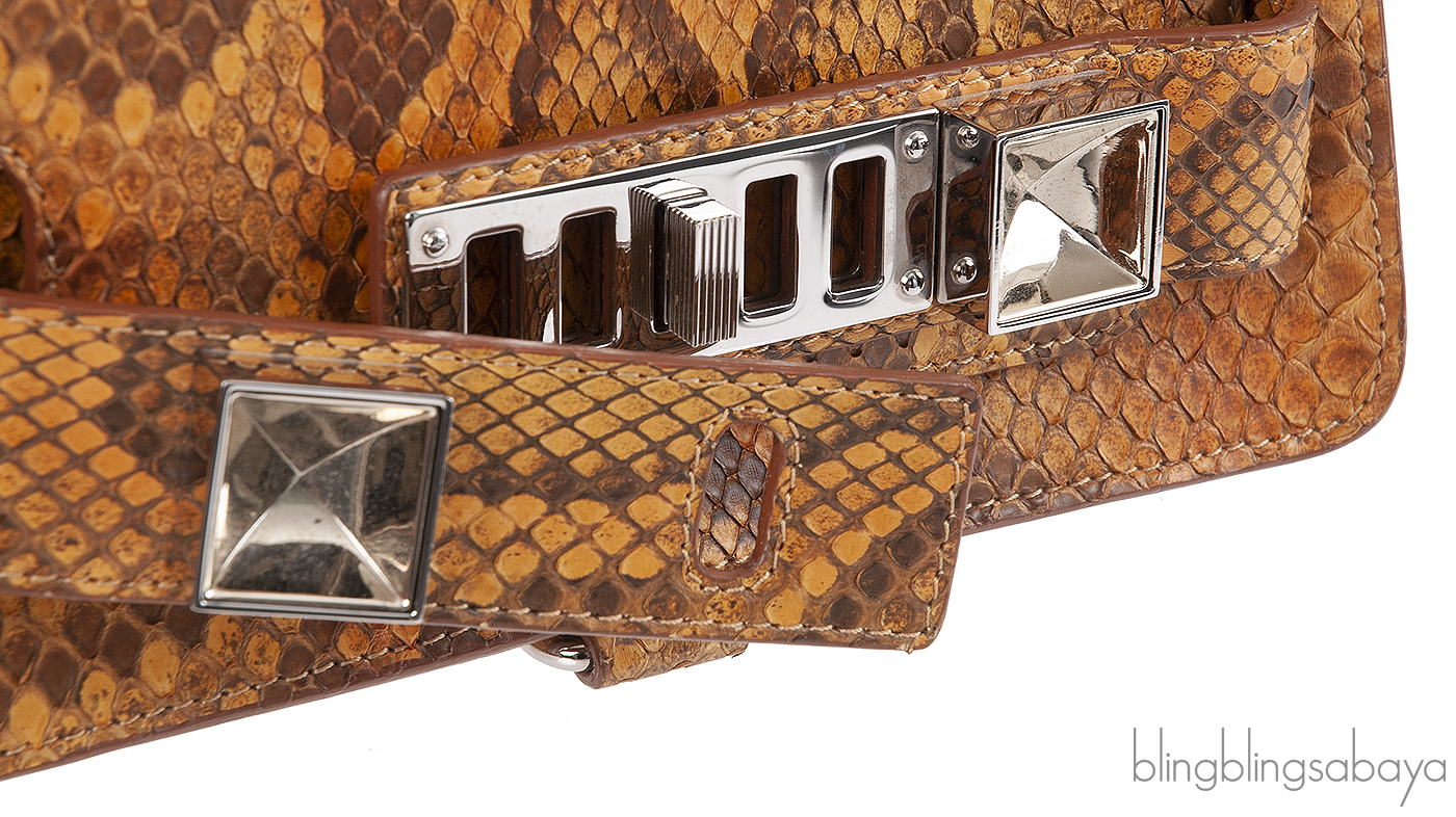 This Proenza Schouler PS11 Python Clutch Bag is crafted from amber exotic python skin and finished with palladium hardware. It features a front flap pocket secured with a belted turn-lock grill, detailed with faceted metal cubes. The snap-fastening front flap opens to a spacious, fabric-lined interior with a zip pocket. A wrist strap is included for easy carrying.